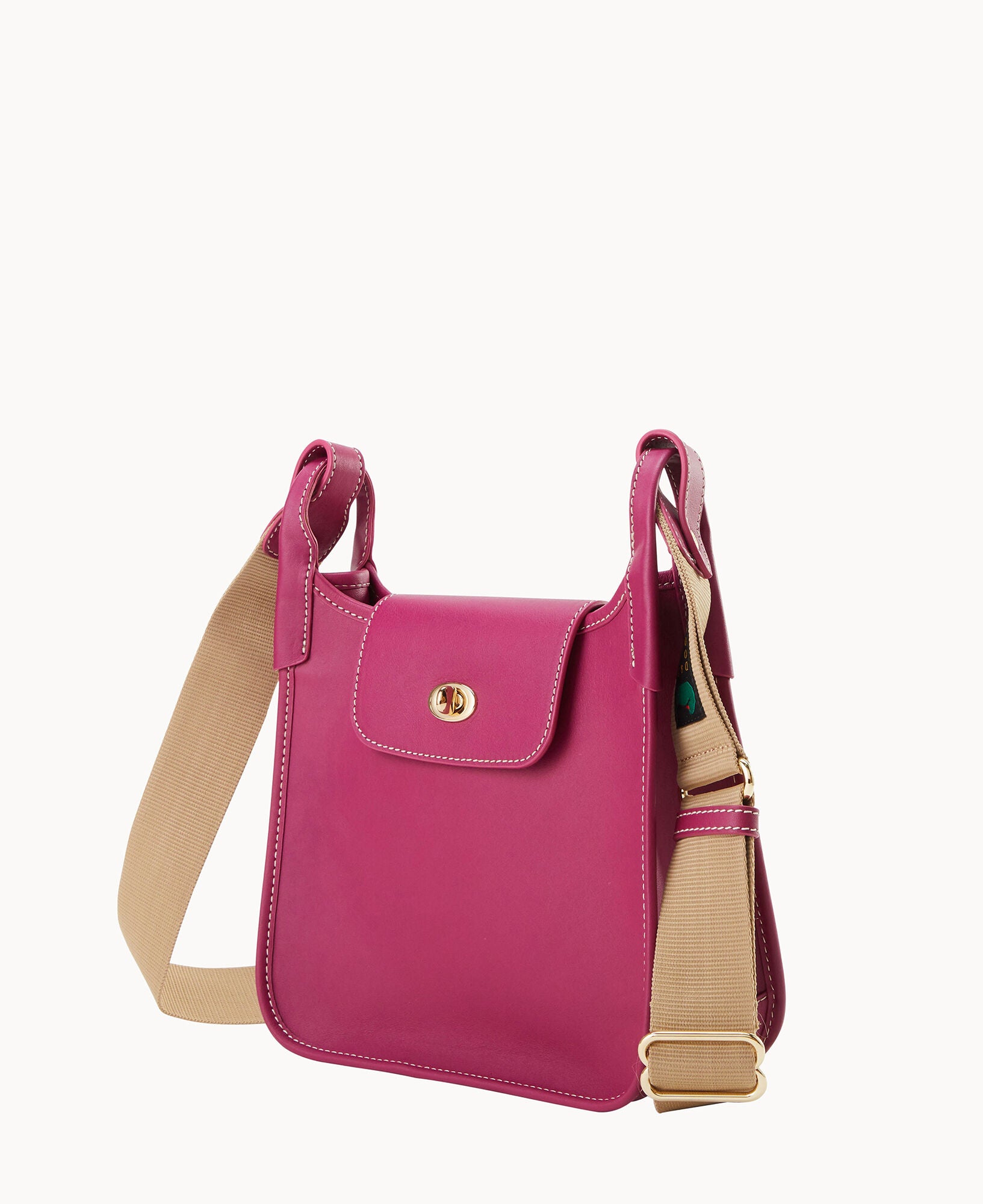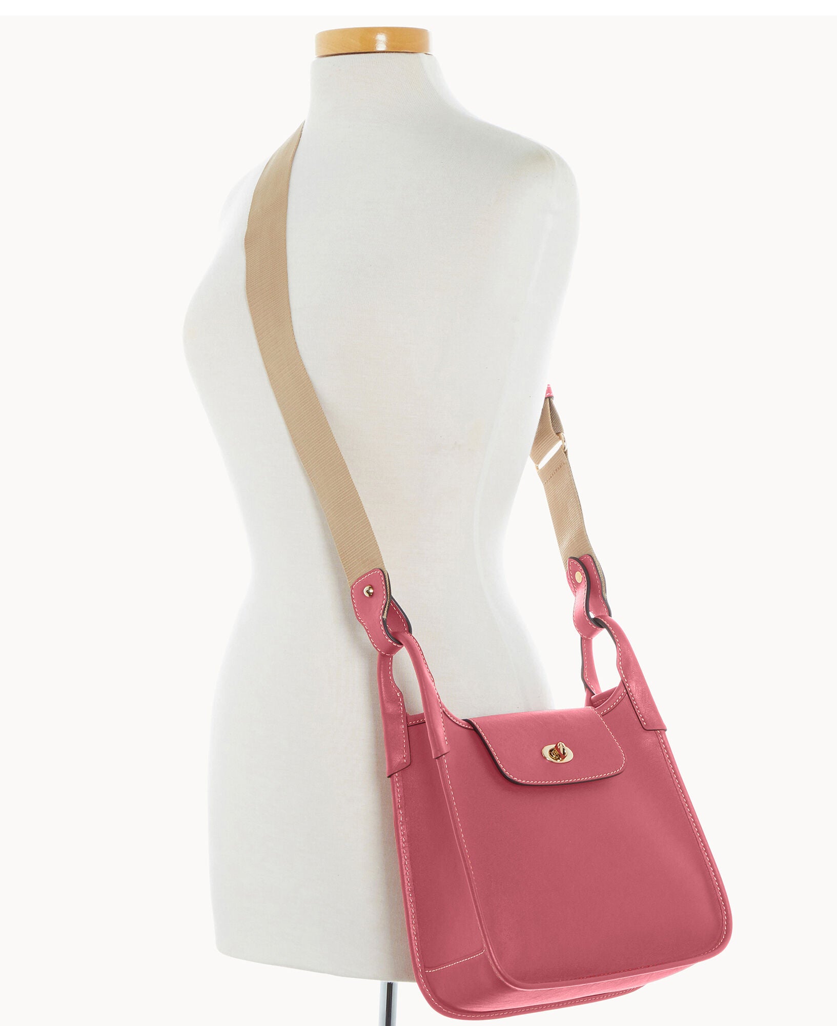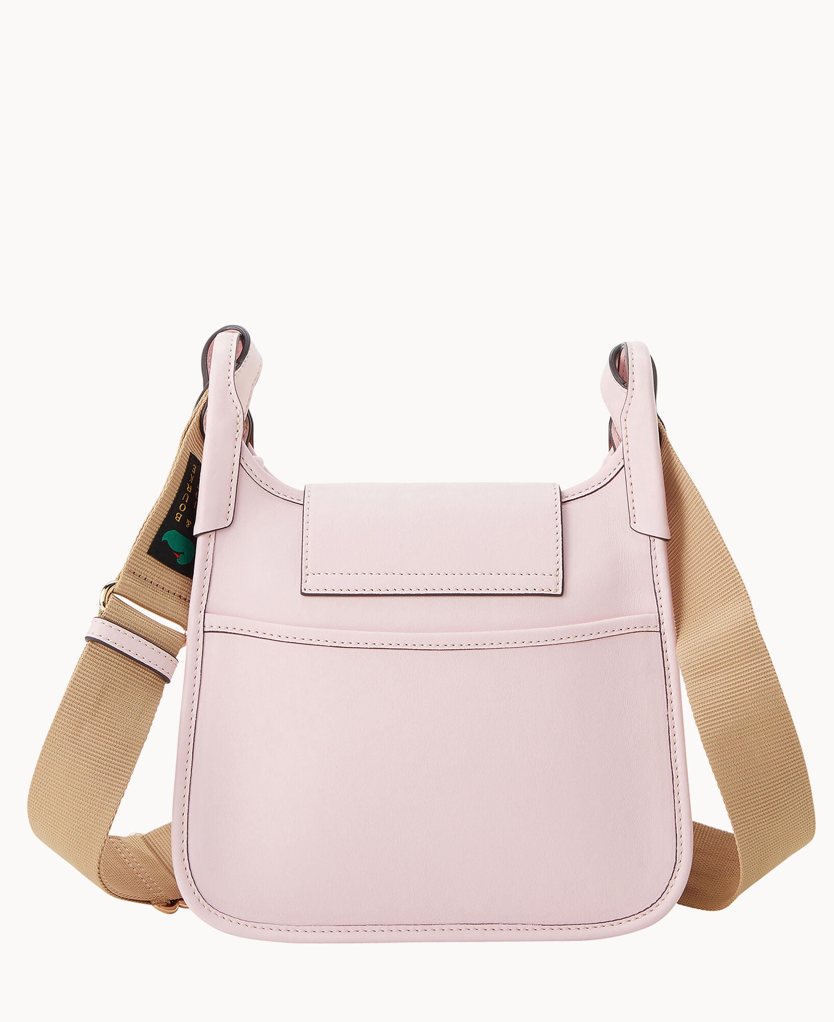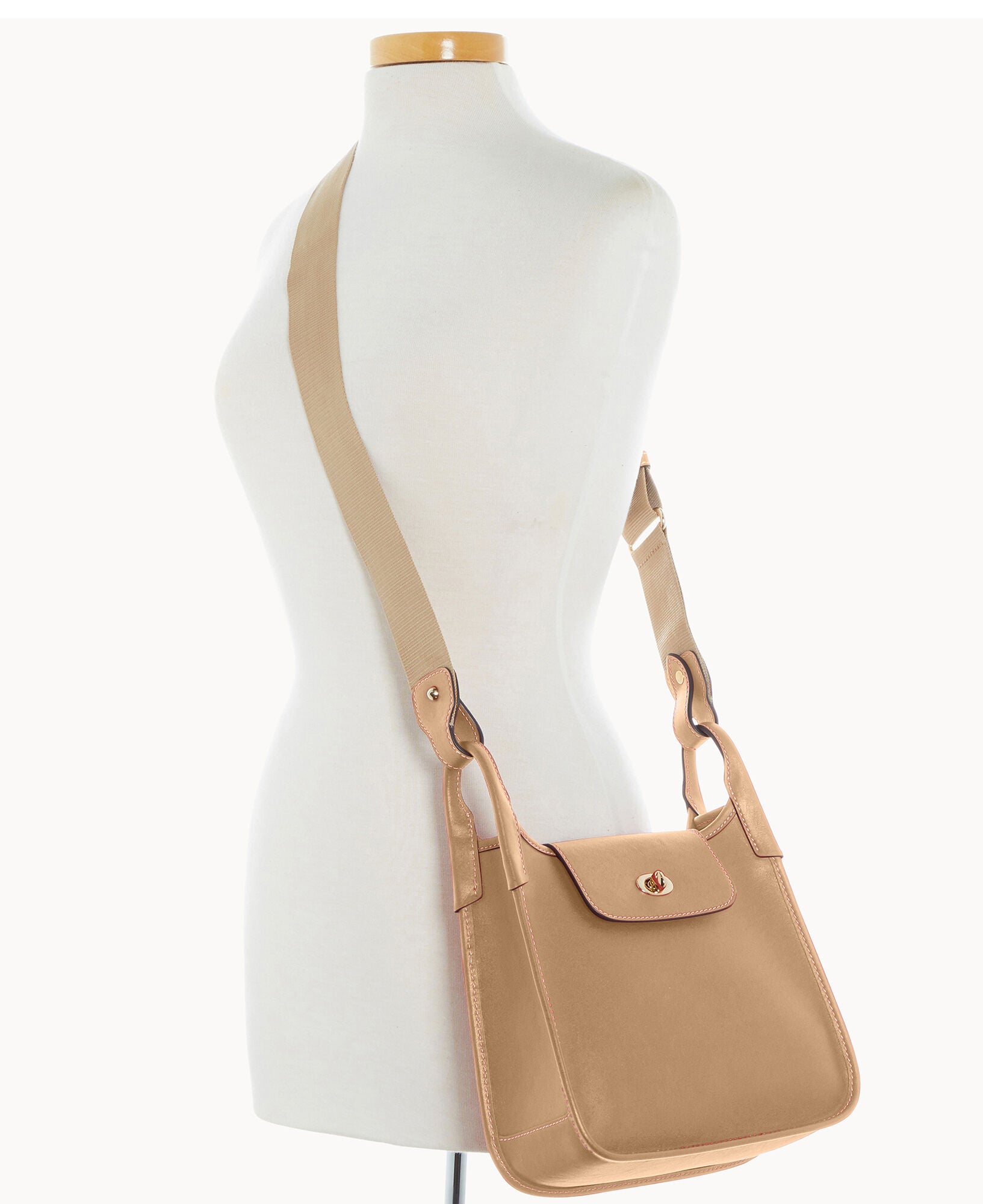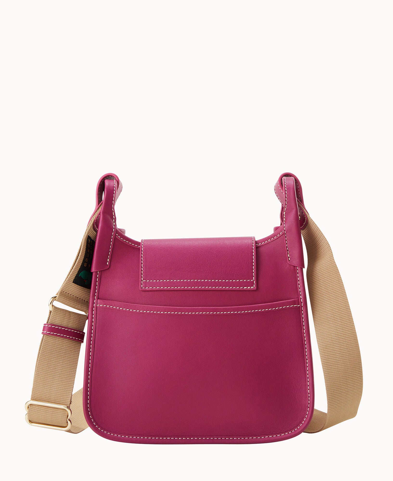One outside pocket. Two inside card slots. Inside key hook. Adjustable shoulder strap. Strap drop length 23″. Lined. Turnlock closure.