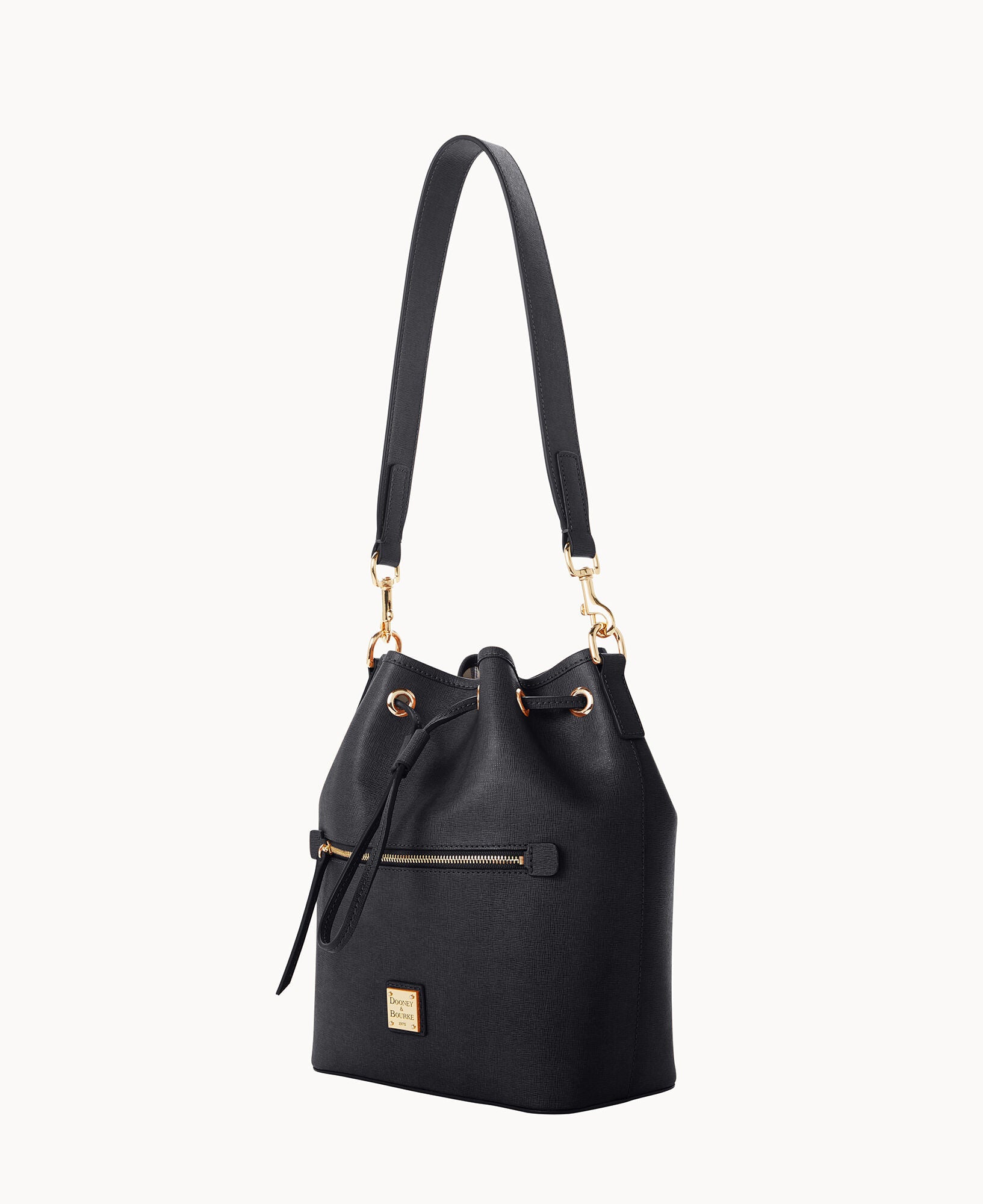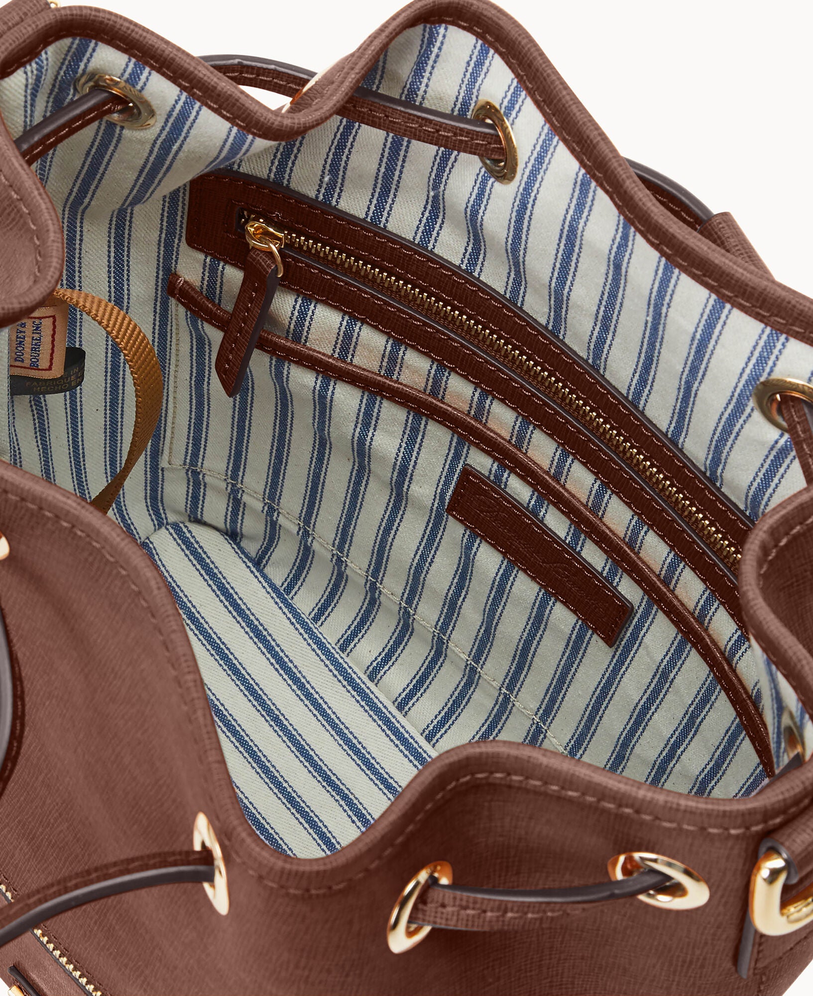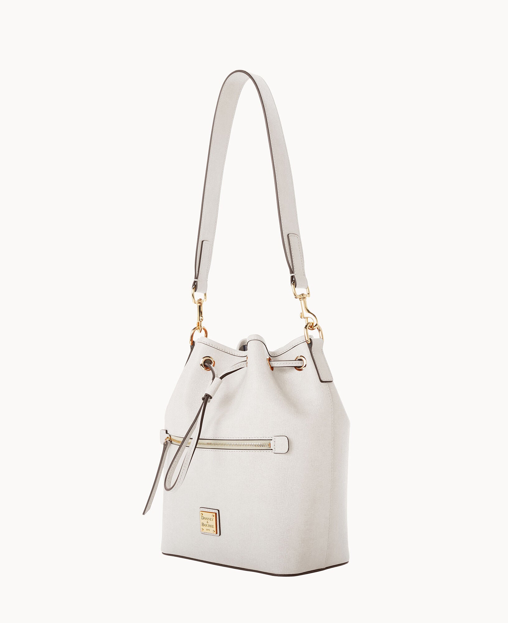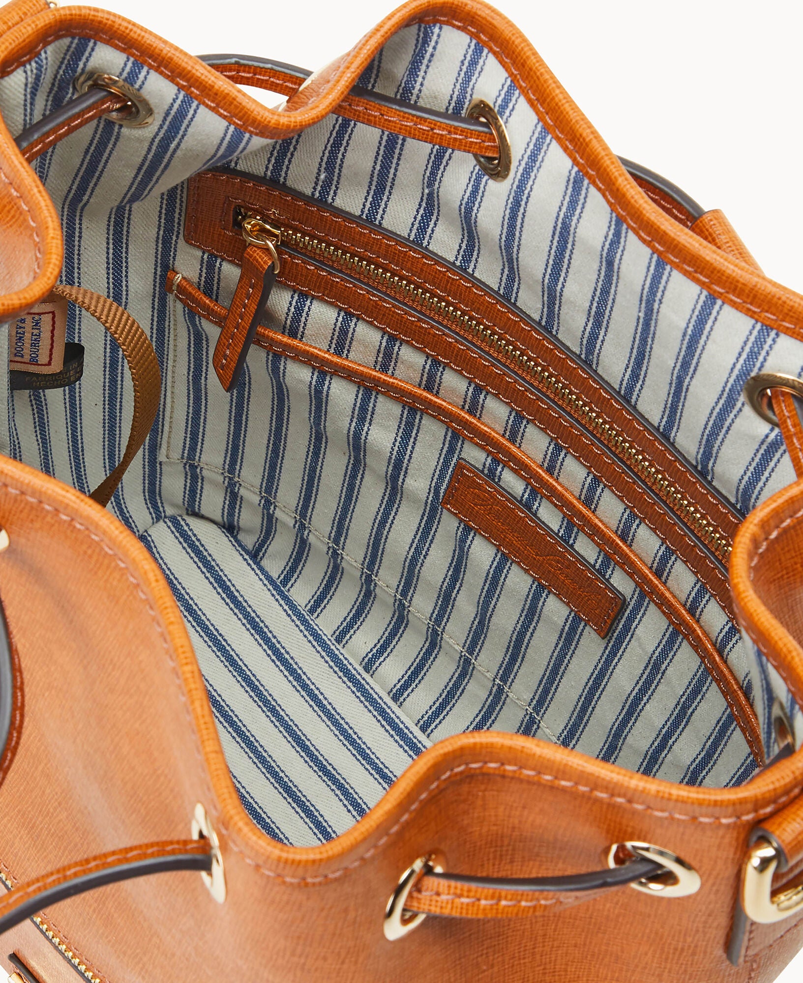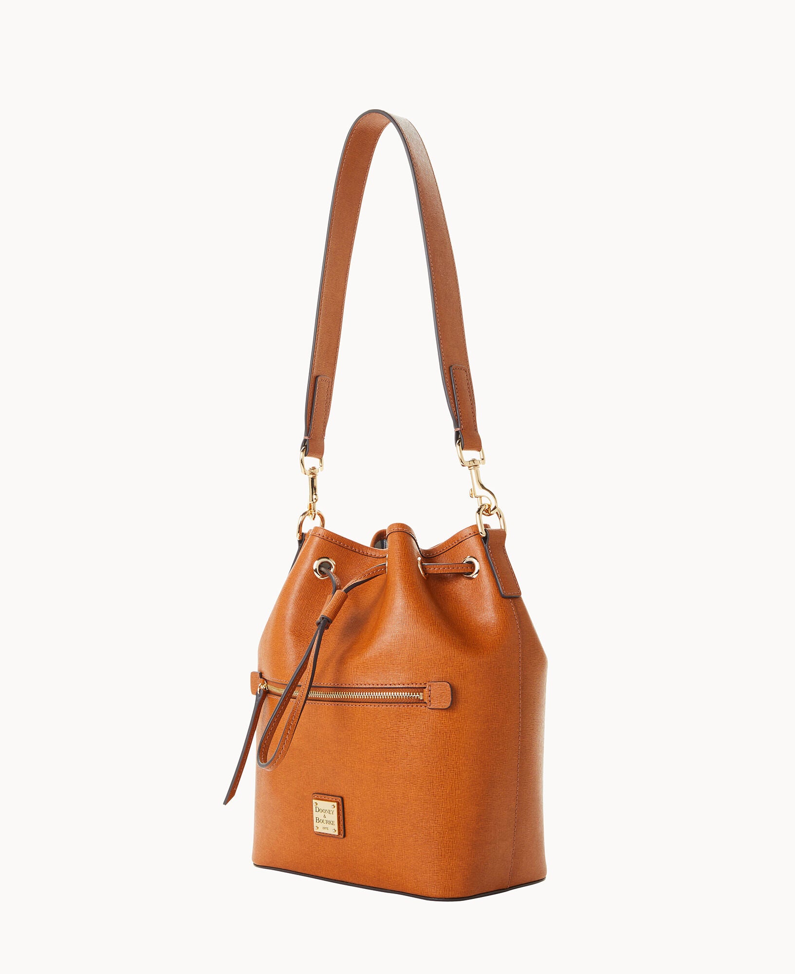 One outside zip pocket. One inside zip pocket. Two inside pockets. Cell phone pocket. Inside key hook. Detachable shoulder strap. Strap drop length 13″. Lined. Feet. Drawstring closure.