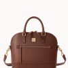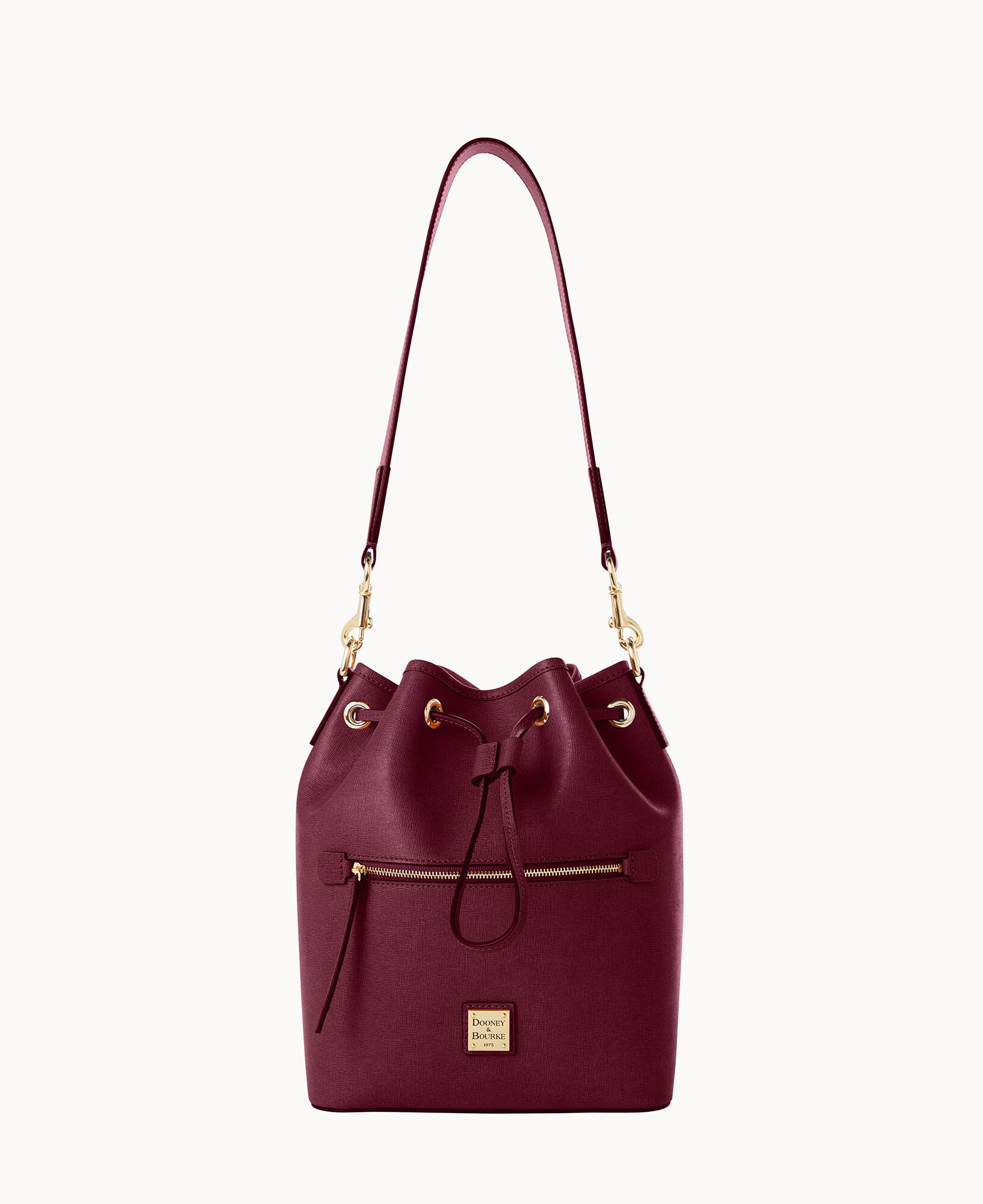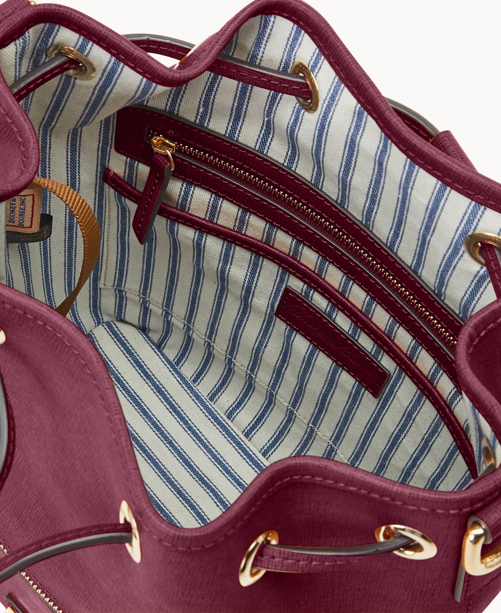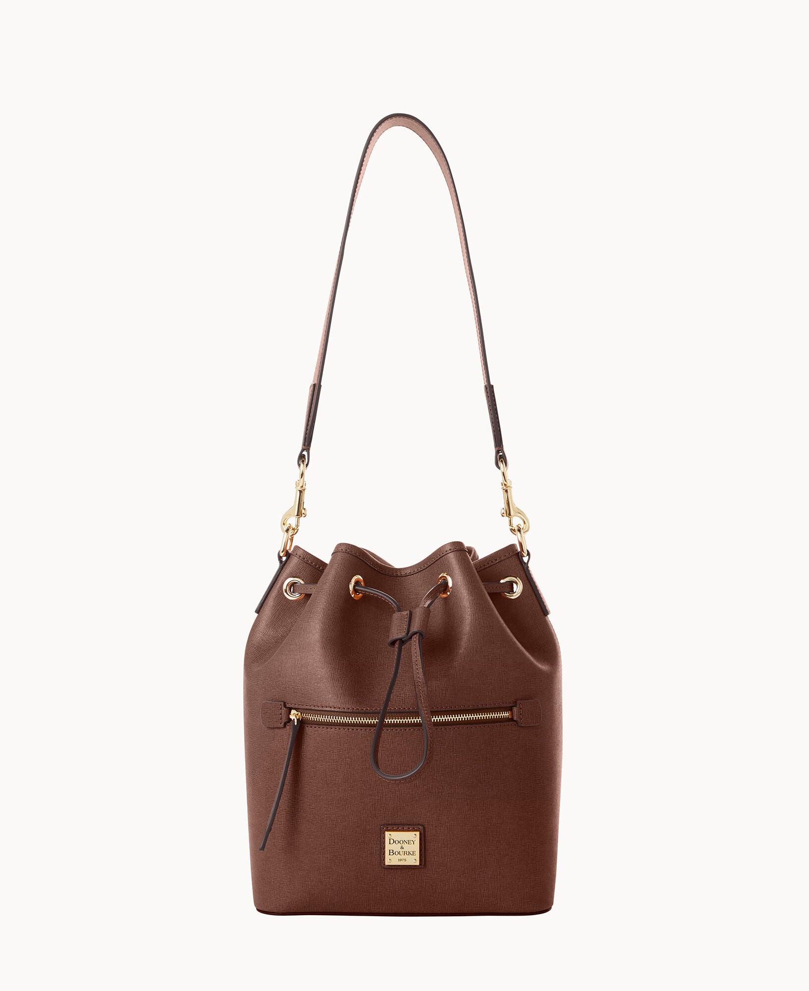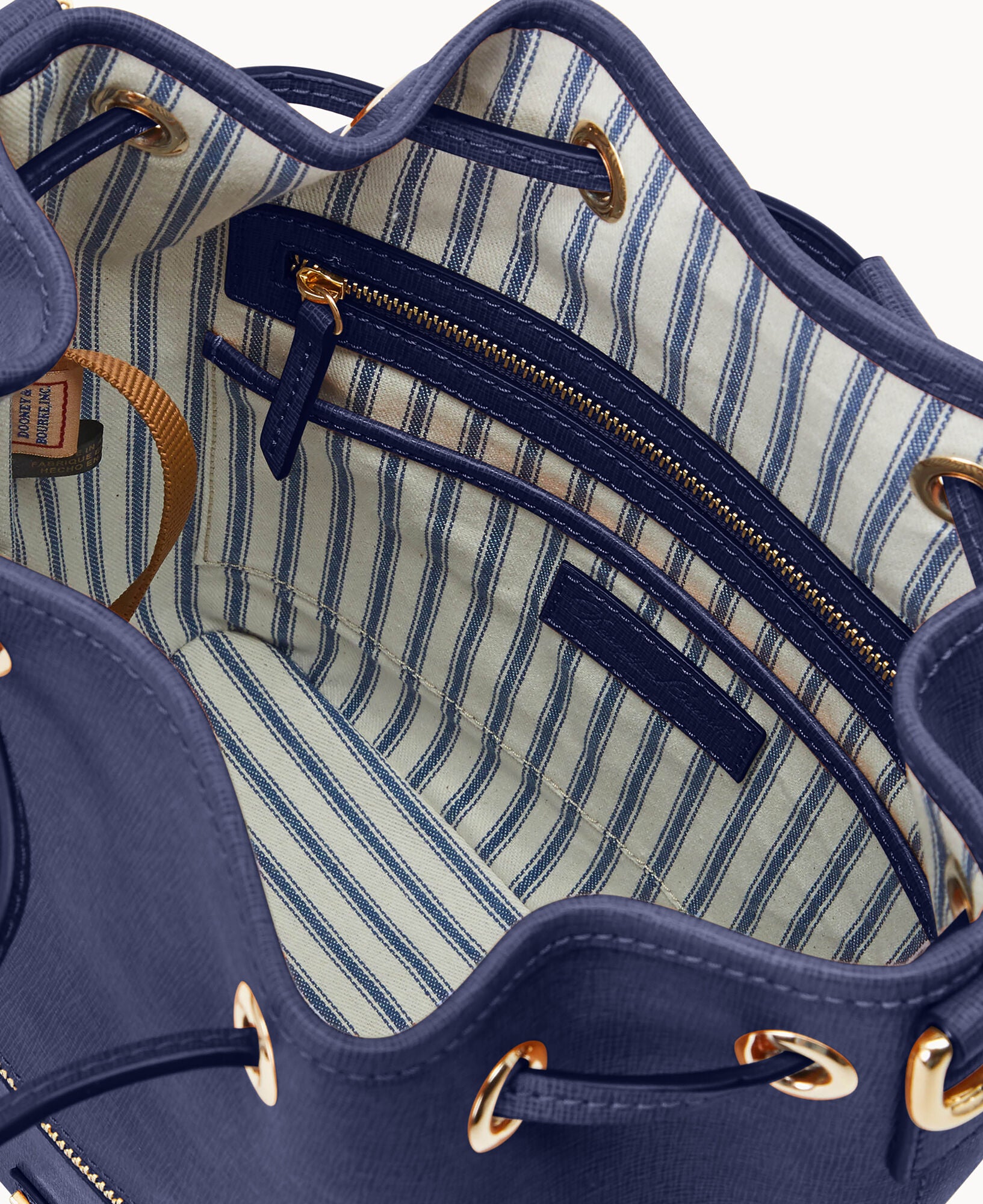 One outside zip pocket. One inside zip pocket. Two inside pockets. Cell phone pocket. Inside key hook. Detachable shoulder strap. Strap drop length 13″. Lined. Feet. Drawstring closure.
