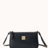 One exterior zip pocket. One interior zip pocket. One interior slip pocket. Interior key hook. Removable strap. Adjustable strap. Lined. Strap drop length 26″. Magnetic snap closure.