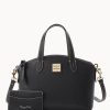 One inside zip pocket. Three inside pockets. Cellphone pocket. Inside key hook. Handle drop length 4.5″. Adjustable, detachable shoulder strap. Strap drop length 18″. Lined. Feet. Zipper closure.