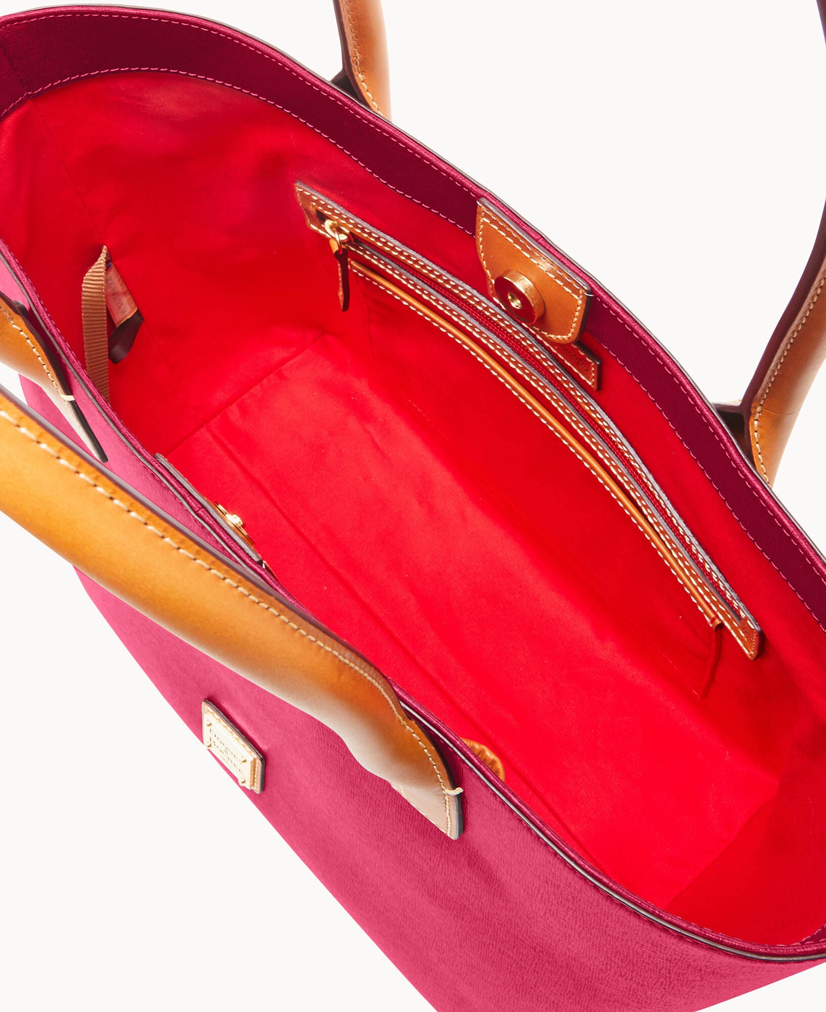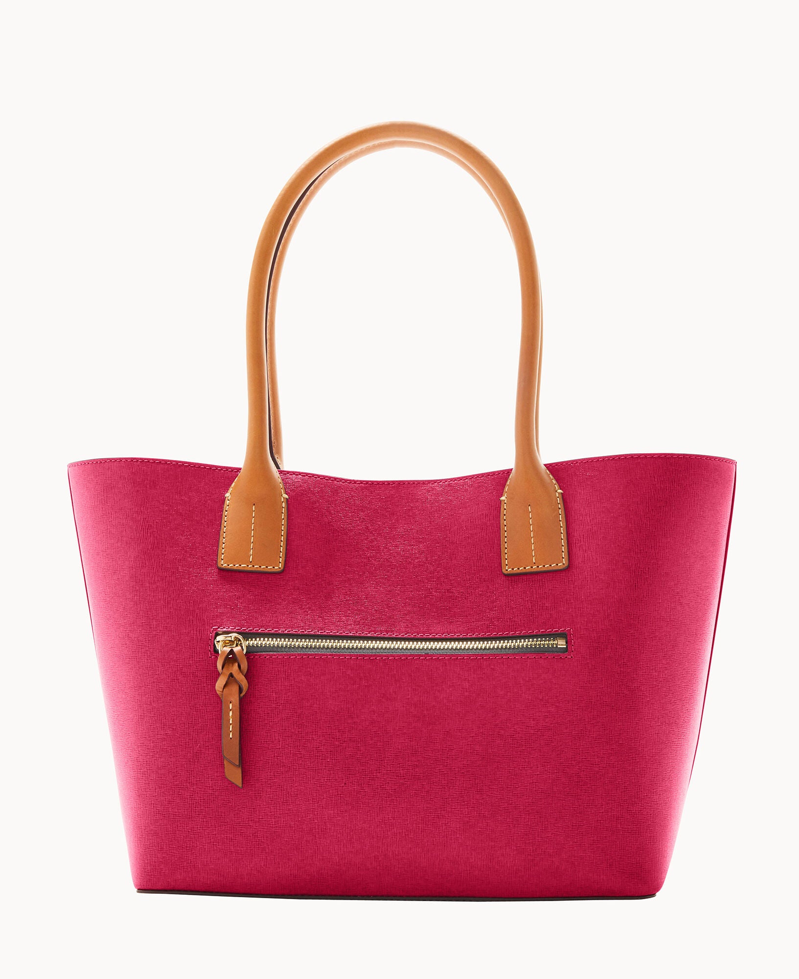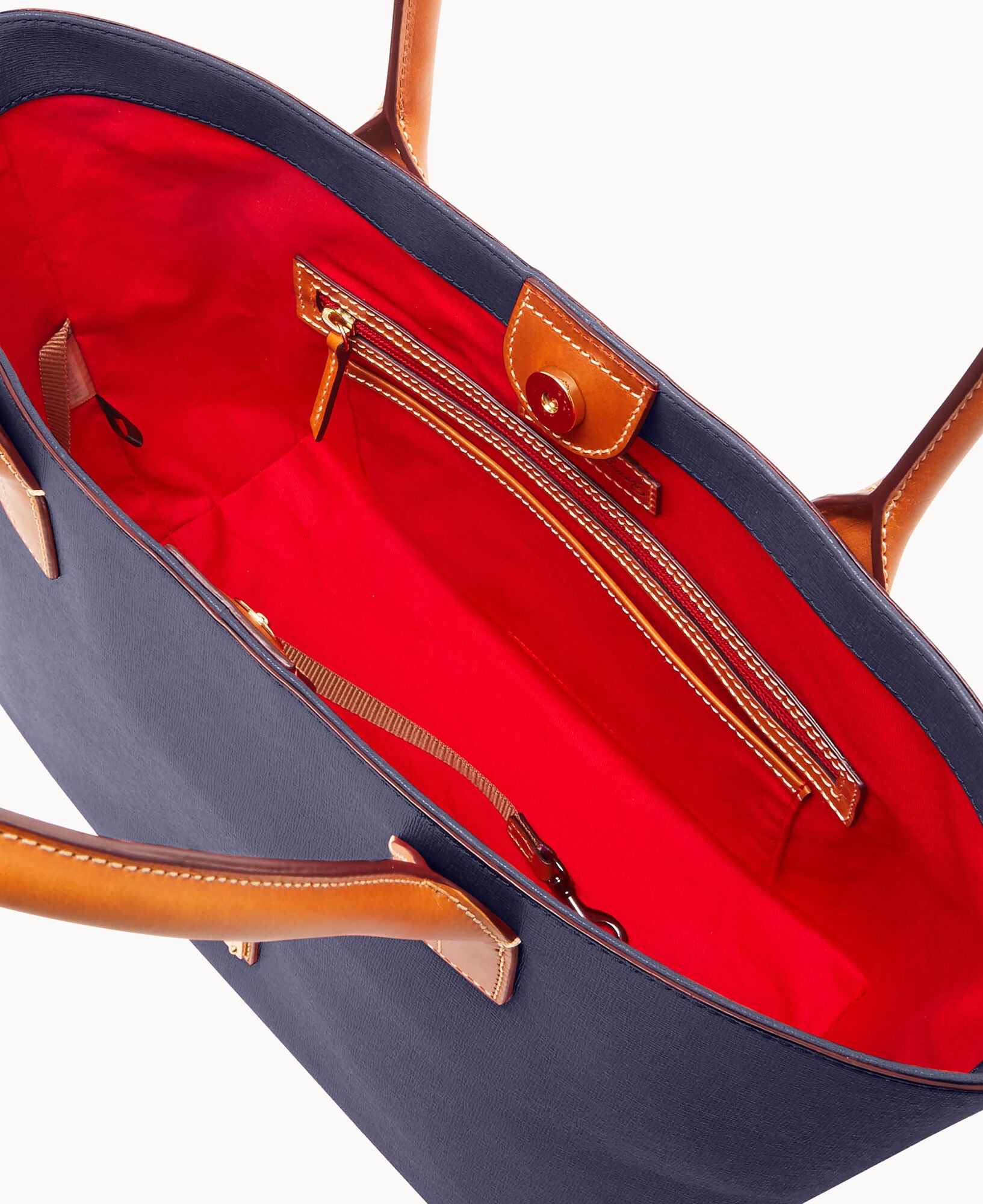Outside zip pocket. One inside zip pocket. Two inside pockets. Cell phone pocket. Inside key hook. Handle drop length 8.5″. Lined. Magnetic snap closure. Feet.
