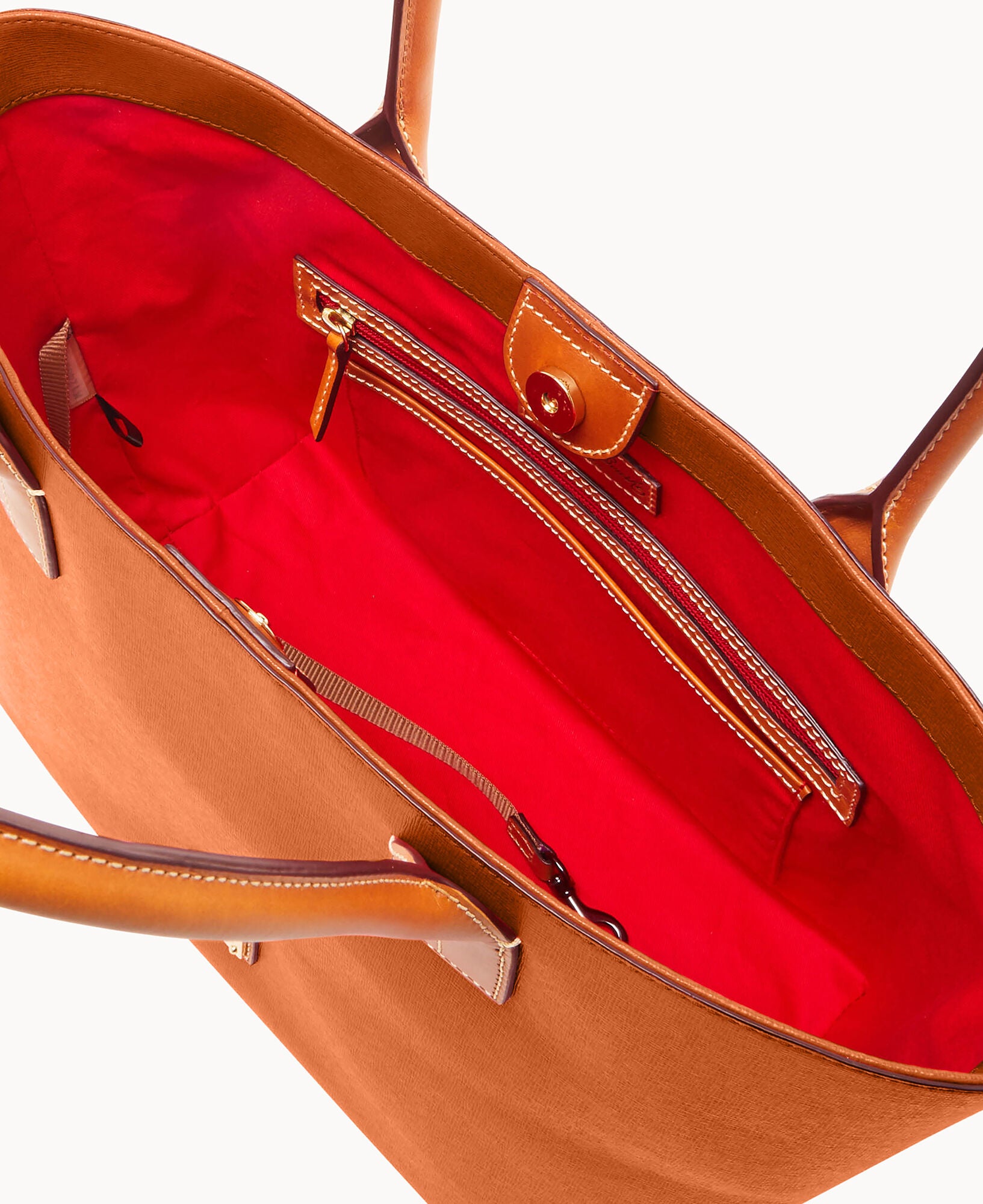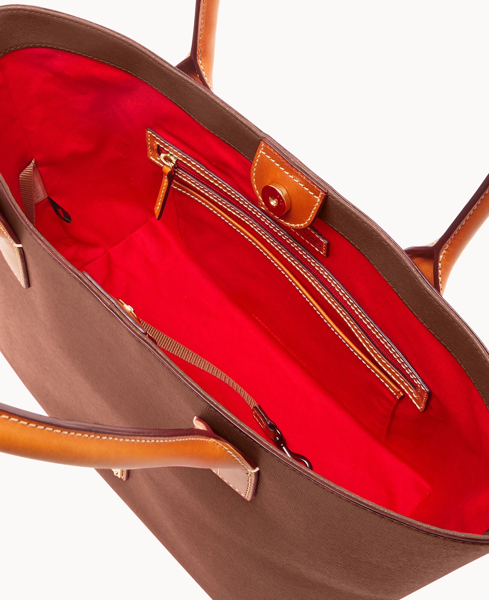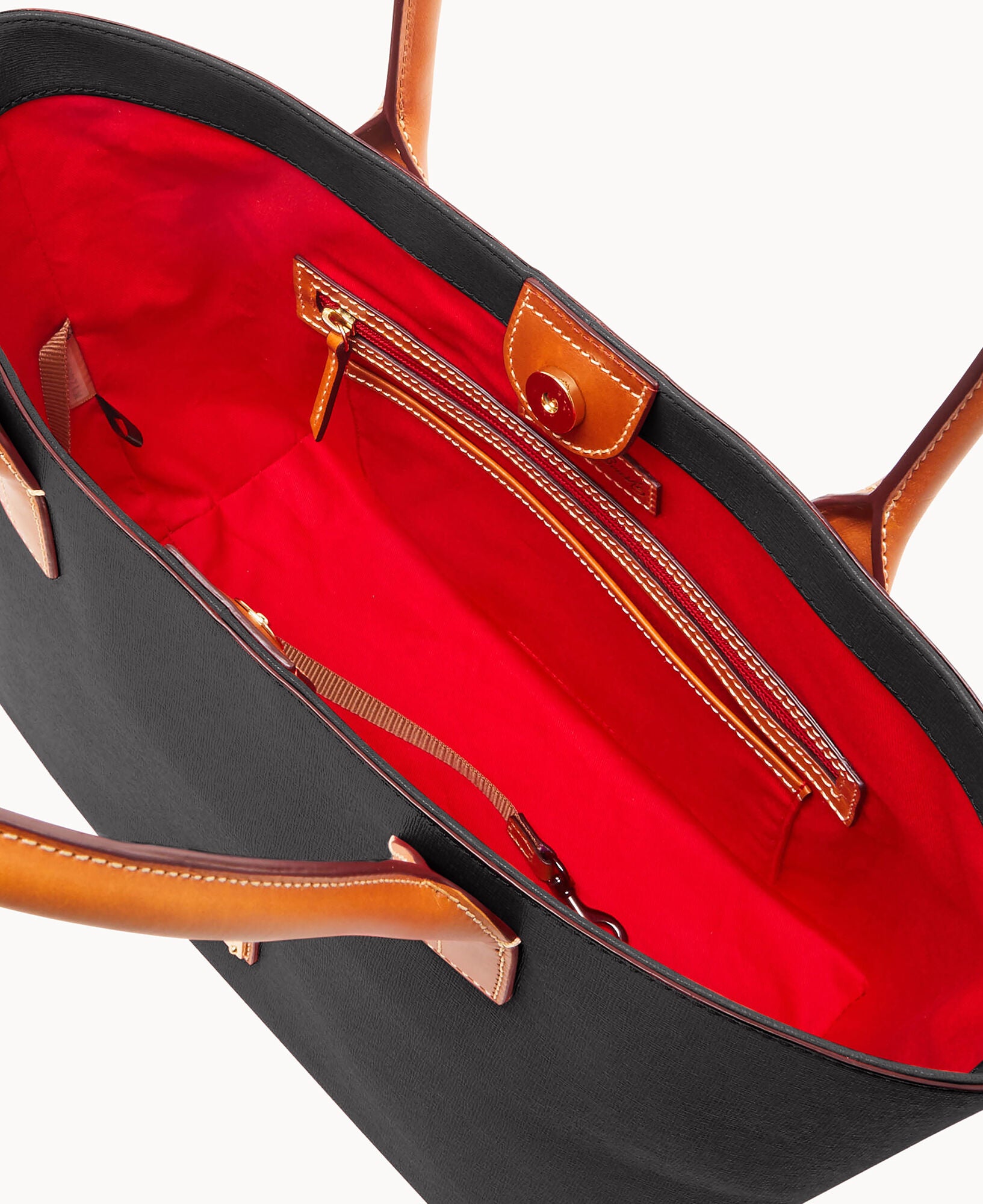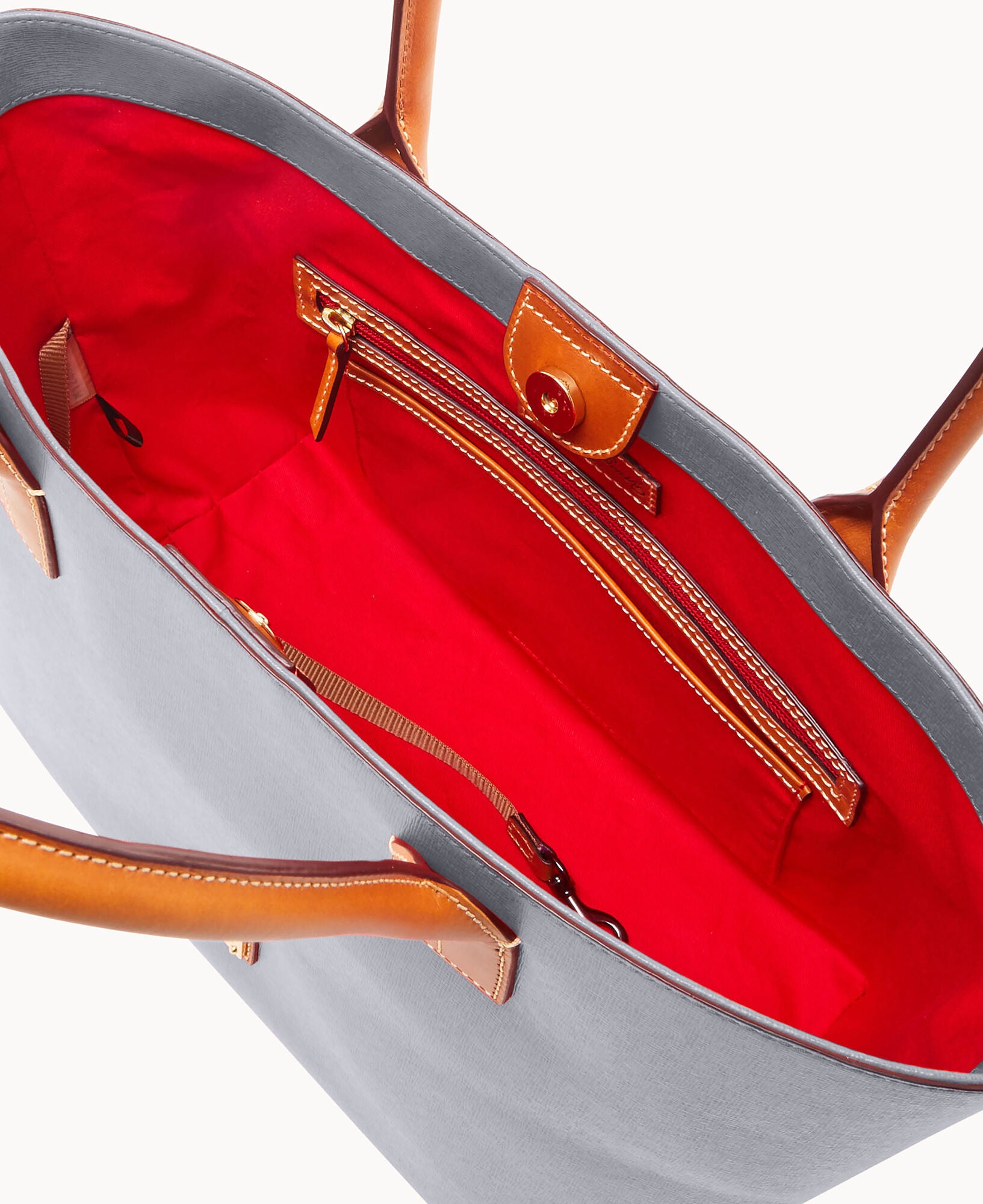 Outside zip pocket. One inside zip pocket. Two inside pockets. Cell phone pocket. Inside key hook. Handle drop length 8.5″. Lined. Magnetic snap closure. Feet.