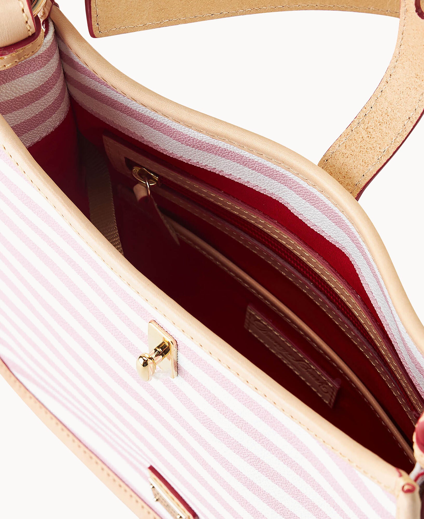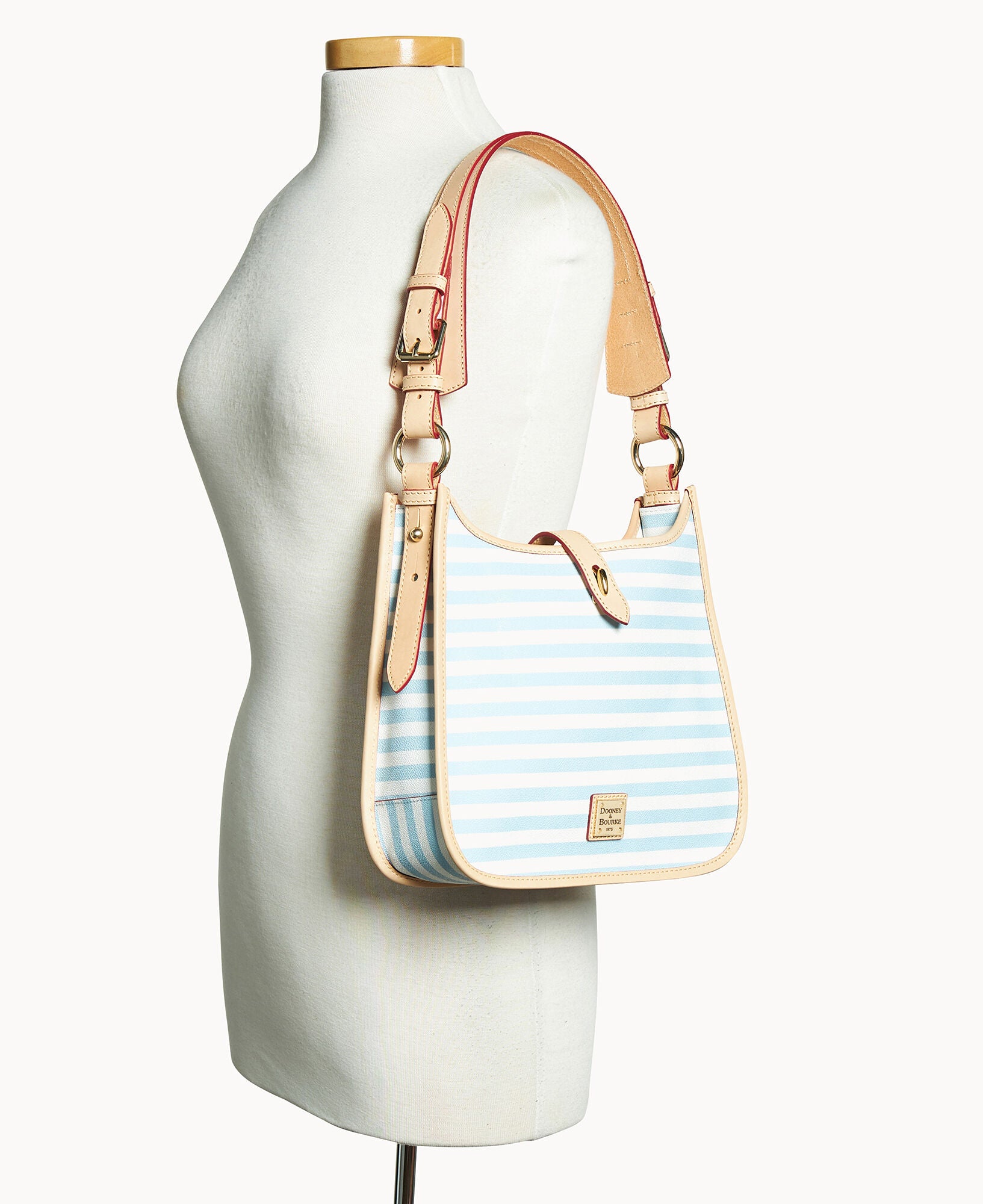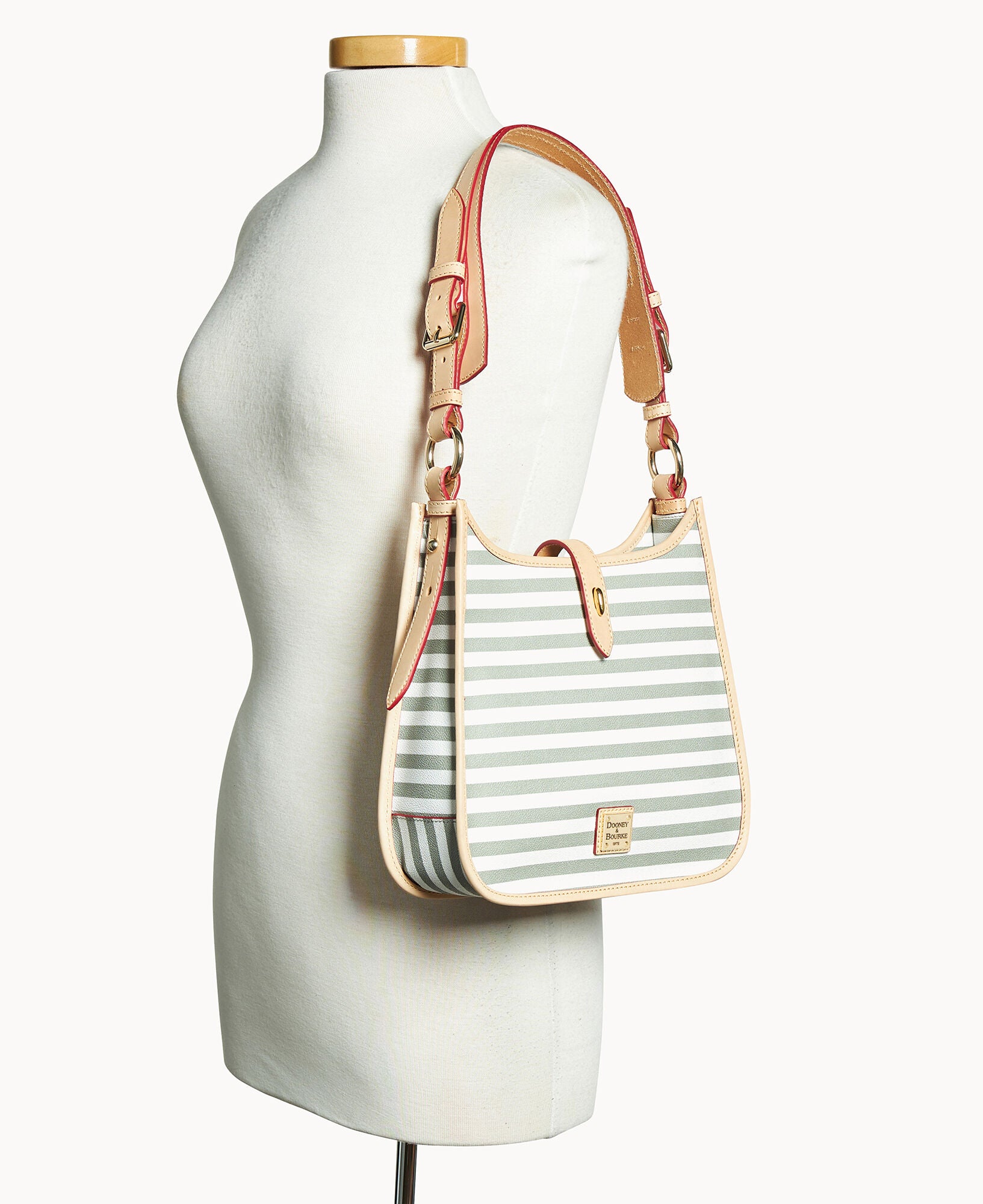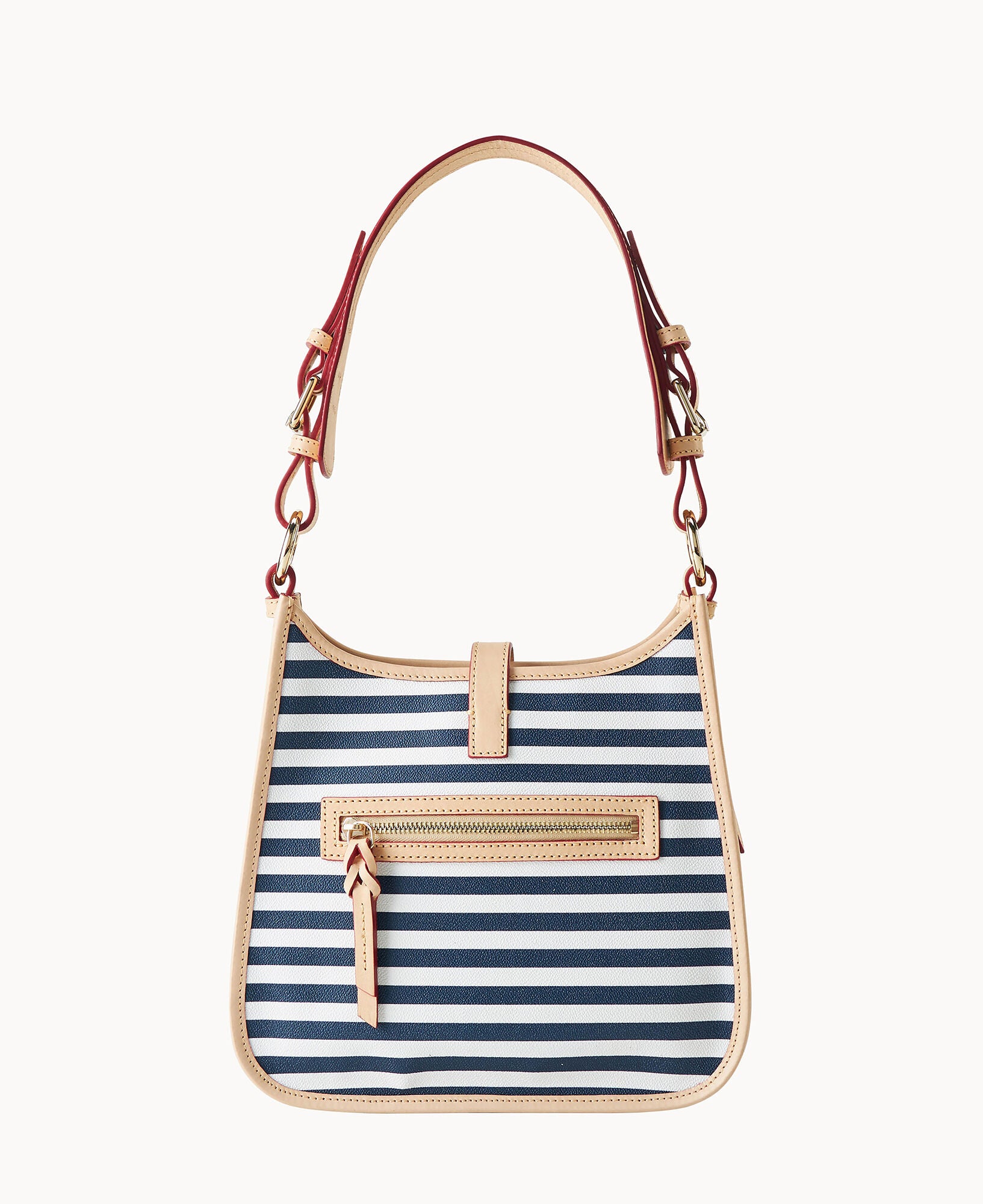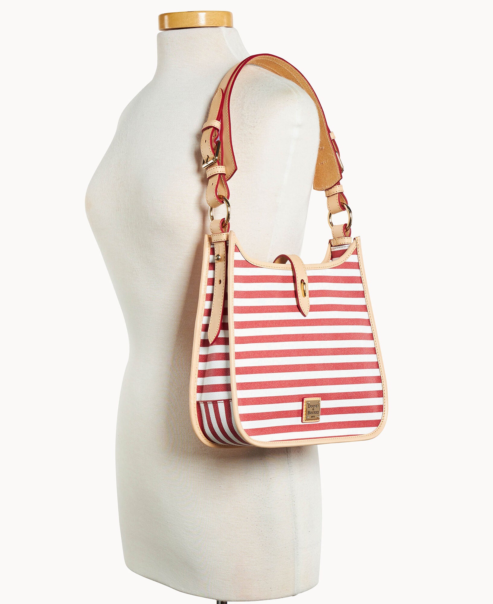 One outside zip pocket. One inside zip pocket. Two inside pockets. Inside key hook. Adjustable shoulder strap. Strap drop length 12″. Lined. Tongue tab buckle closure.