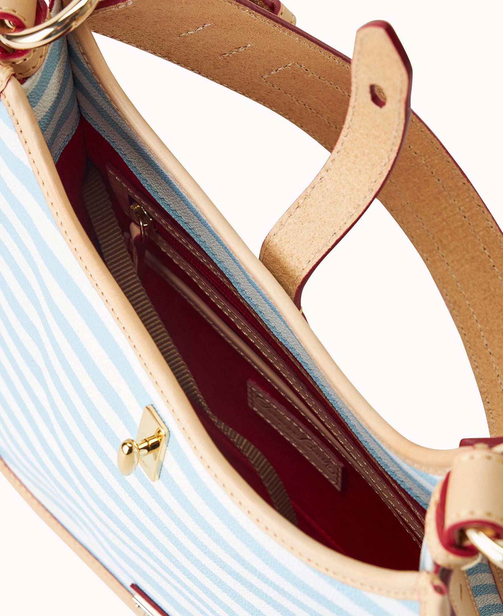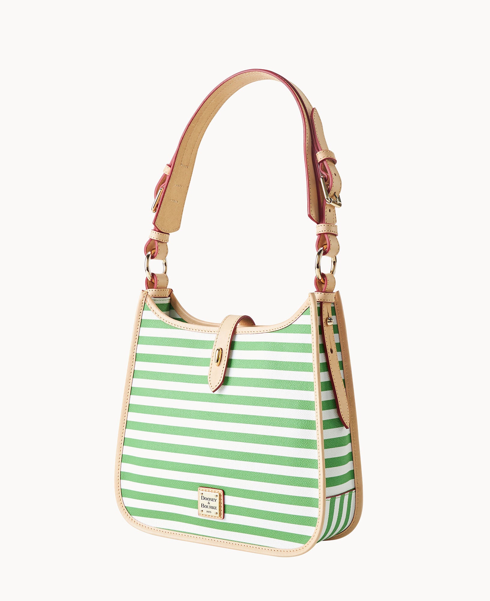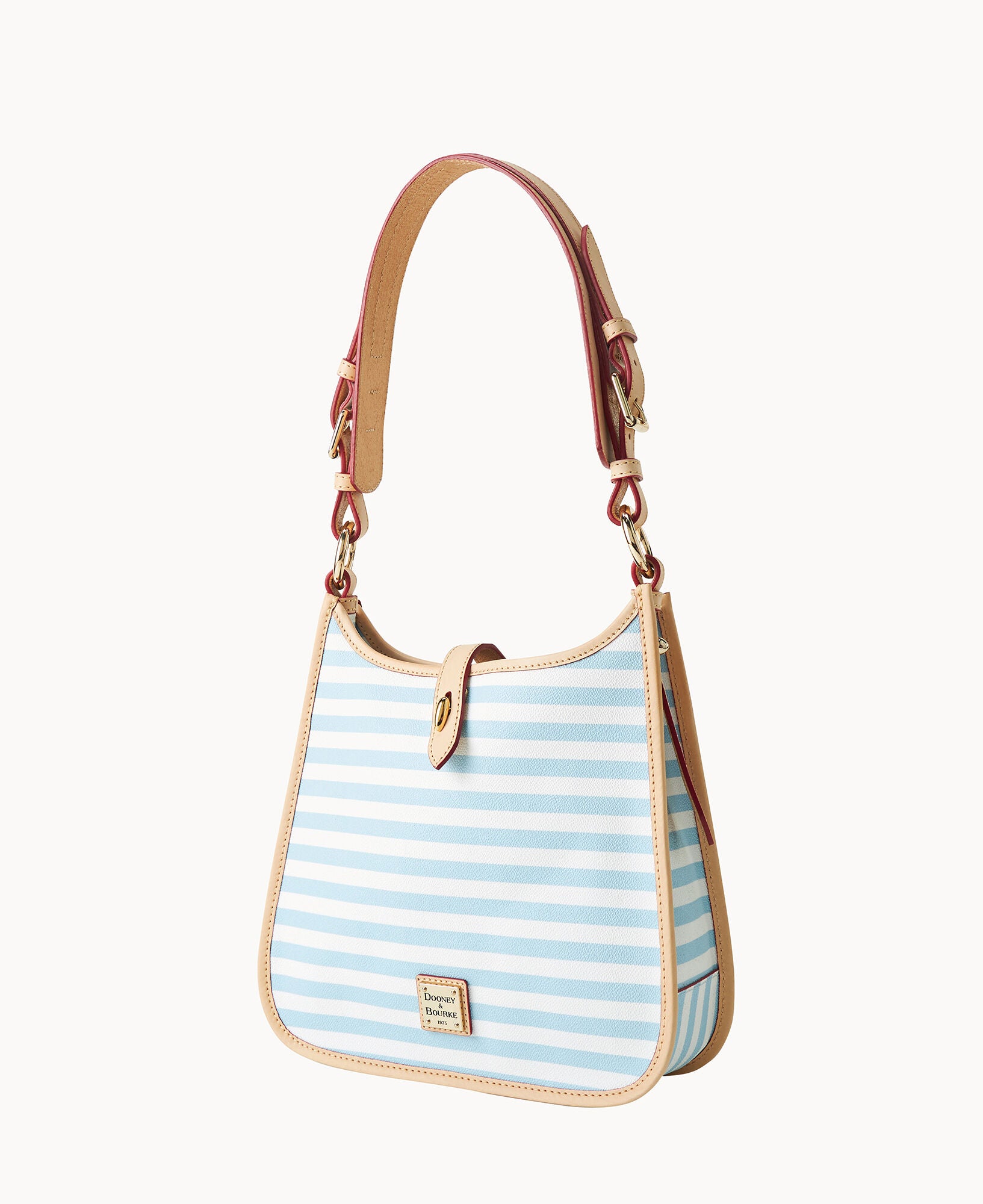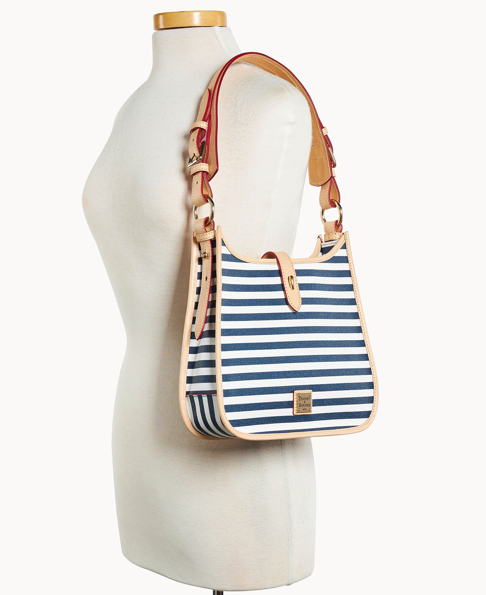 One outside zip pocket. One inside zip pocket. Two inside pockets. Inside key hook. Adjustable shoulder strap. Strap drop length 12″. Lined. Tongue tab buckle closure.
