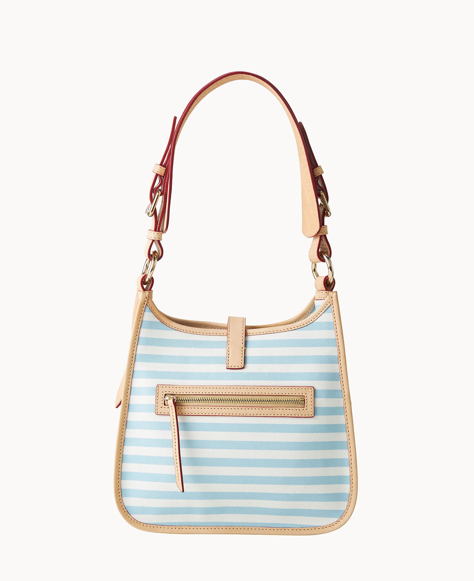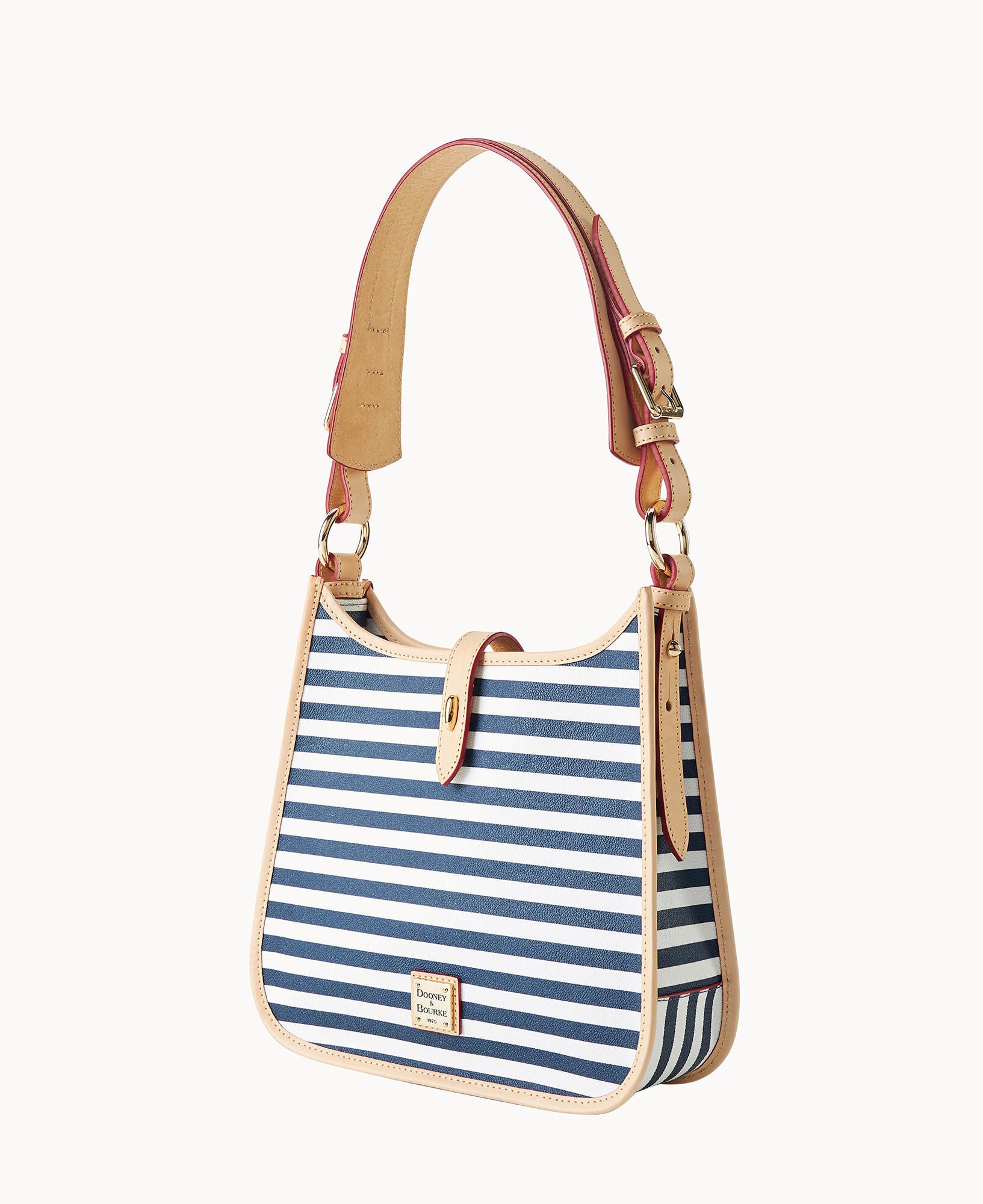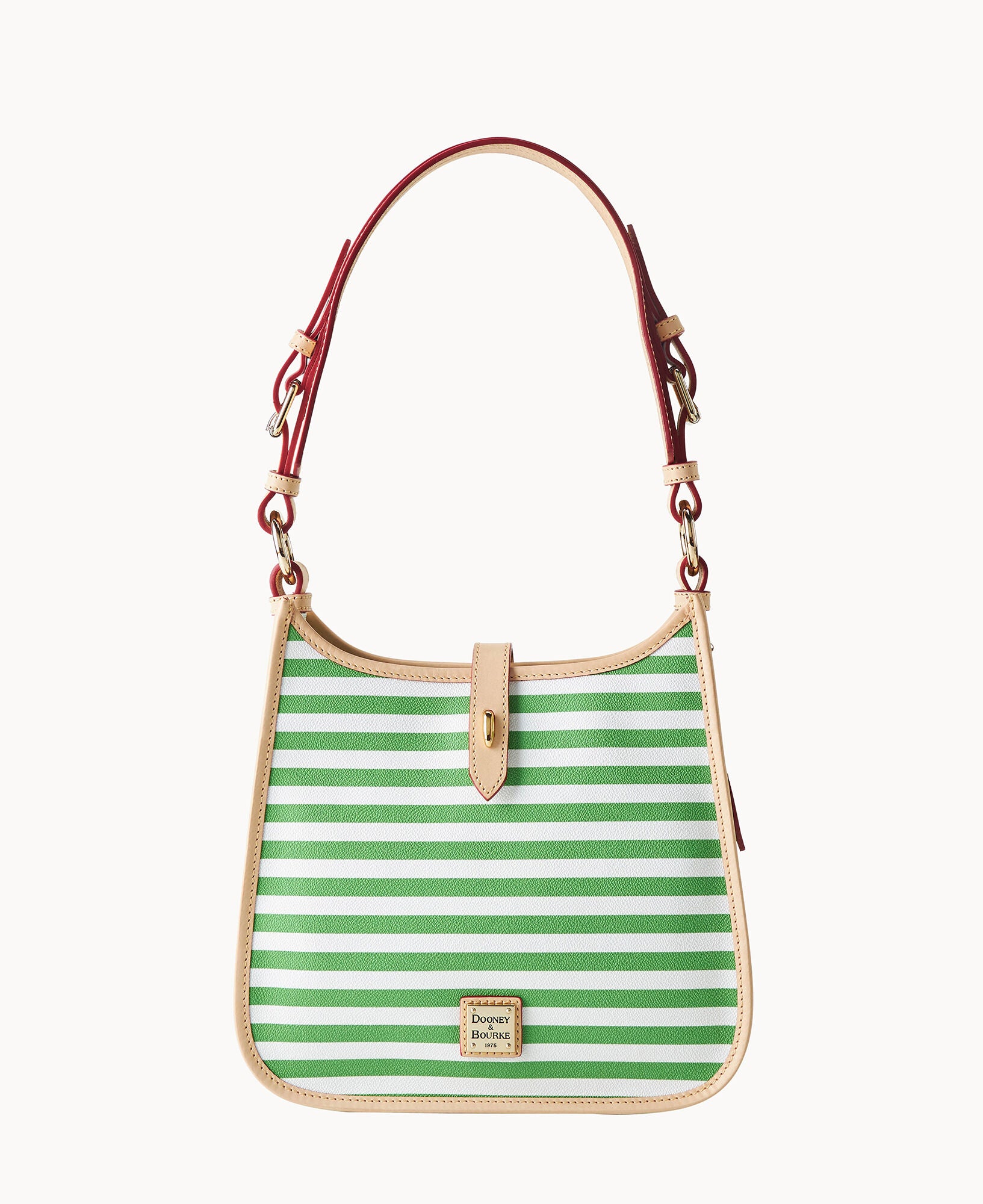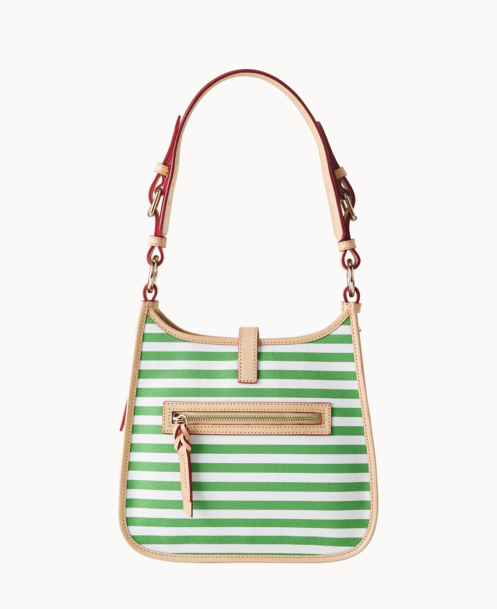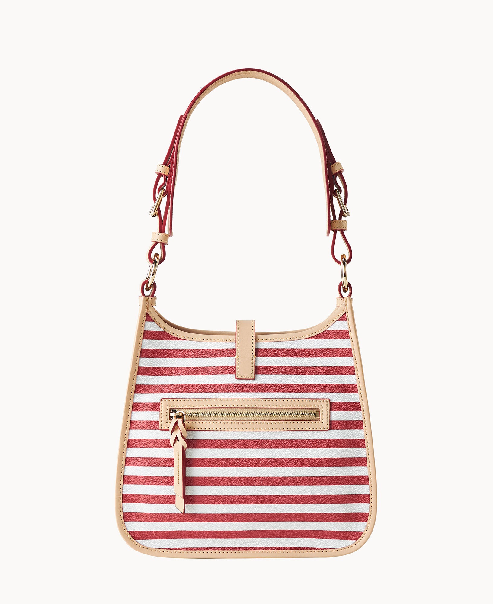 One outside zip pocket. One inside zip pocket. Two inside pockets. Inside key hook. Adjustable shoulder strap. Strap drop length 12″. Lined. Tongue tab buckle closure.