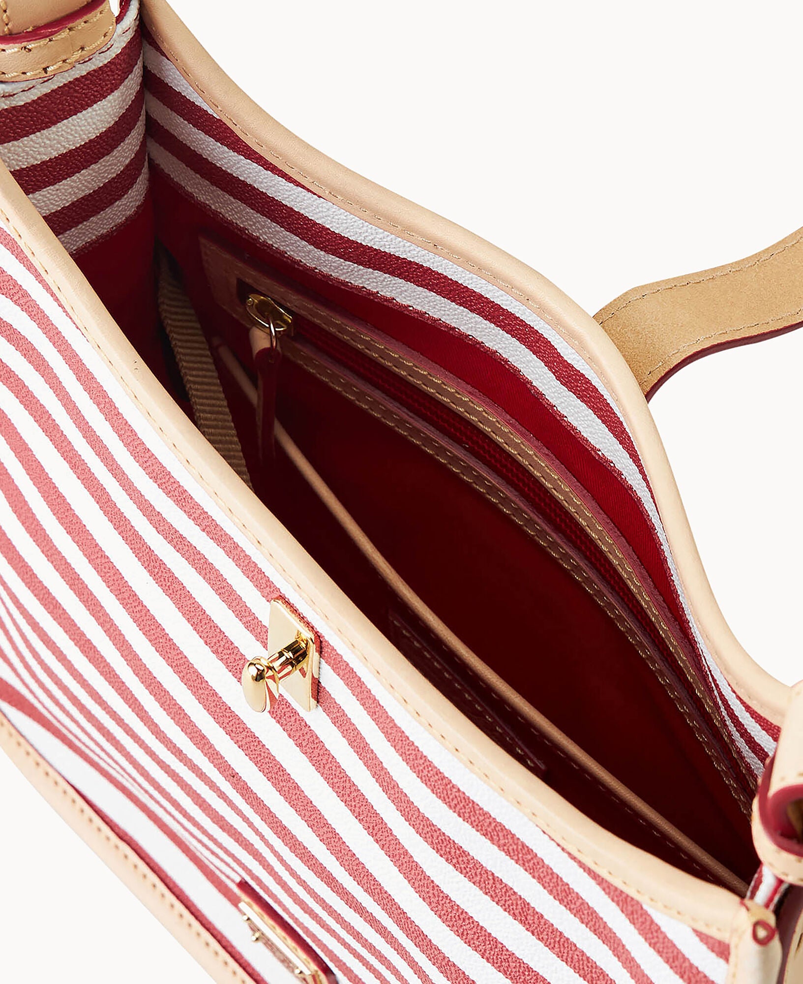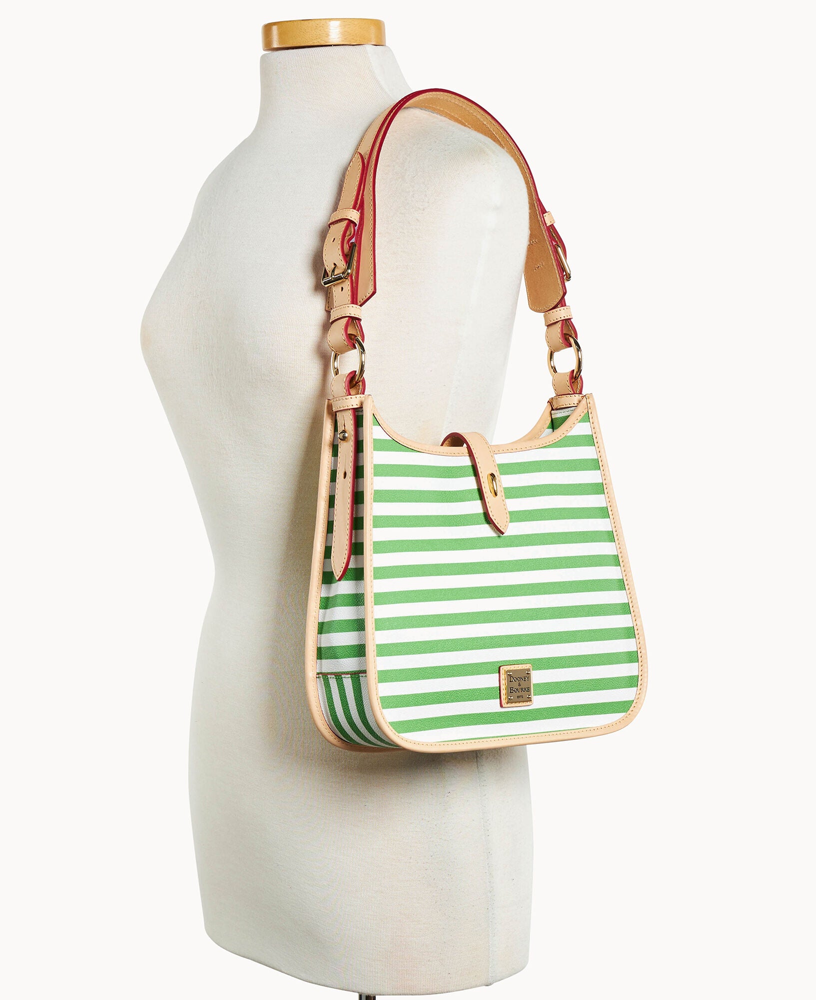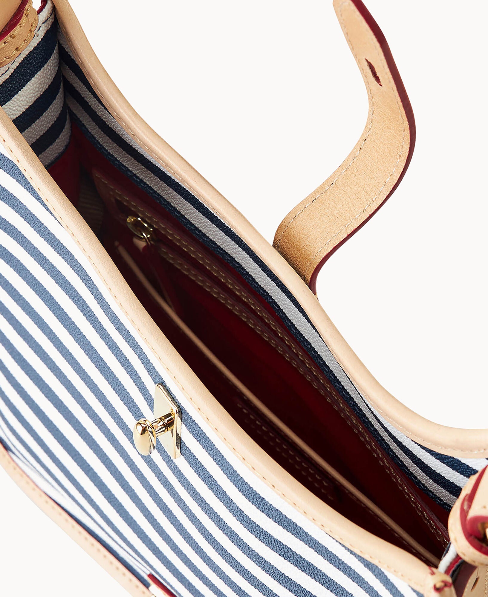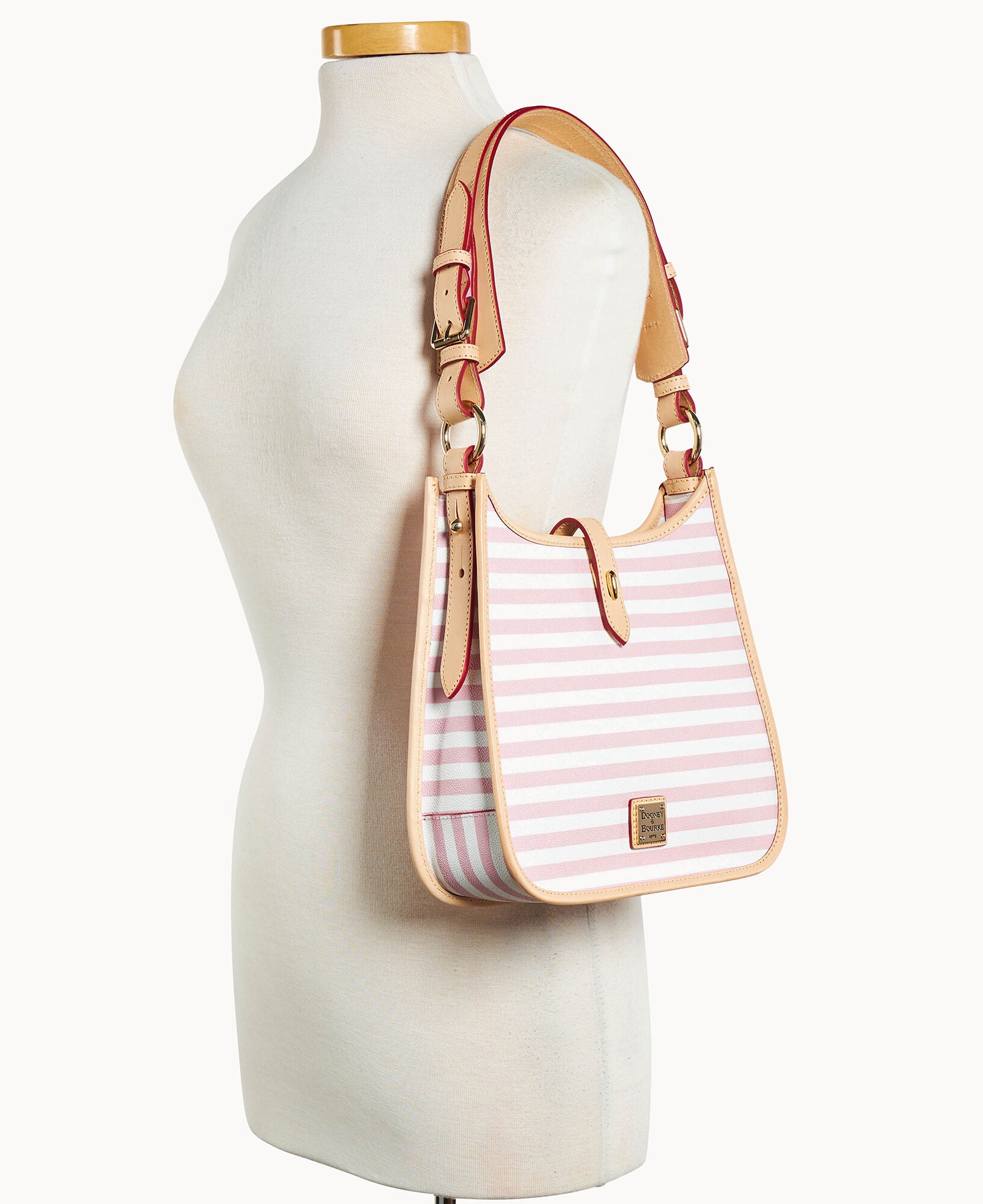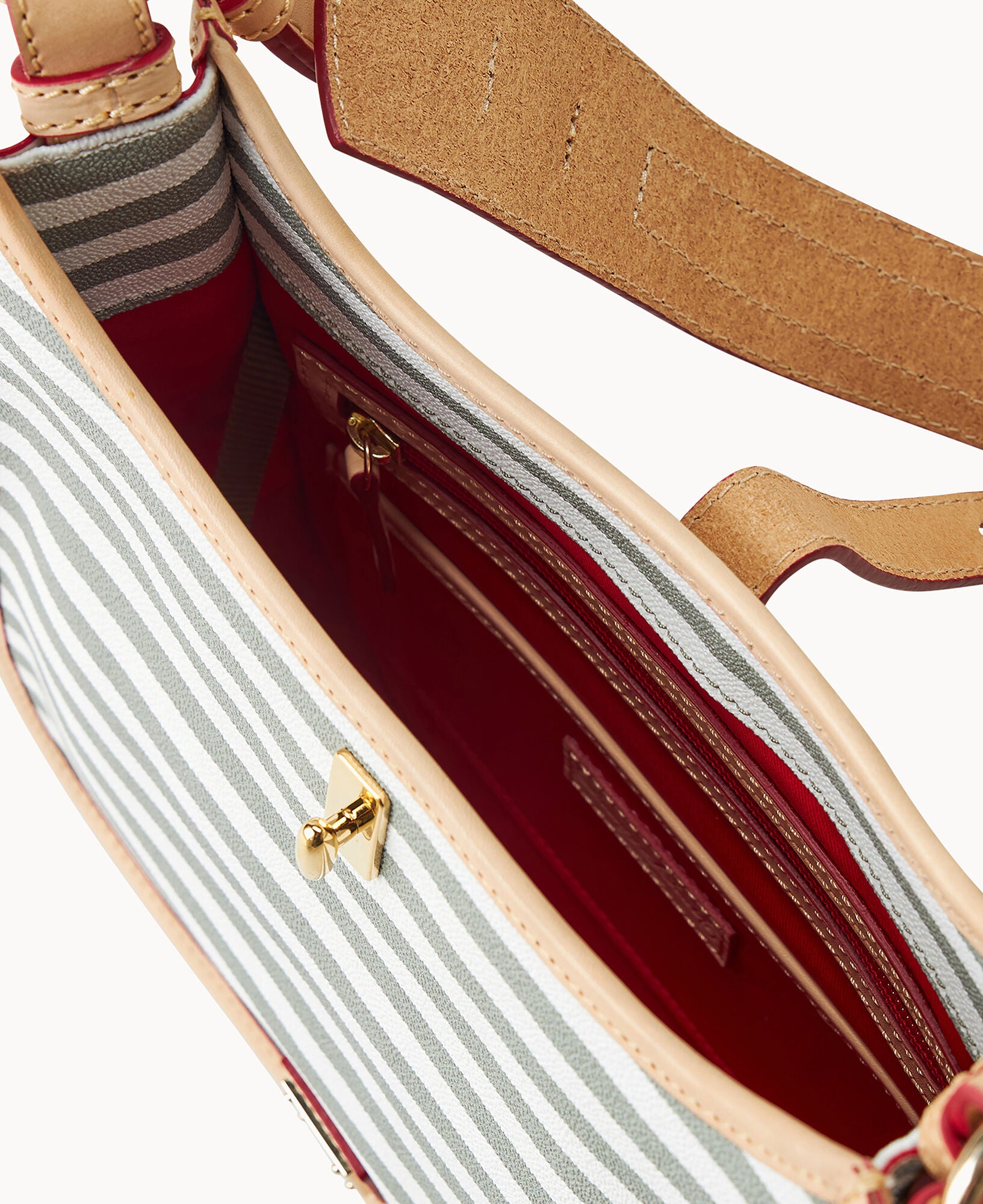 One outside zip pocket. One inside zip pocket. Two inside pockets. Inside key hook. Adjustable shoulder strap. Strap drop length 12″. Lined. Tongue tab buckle closure.