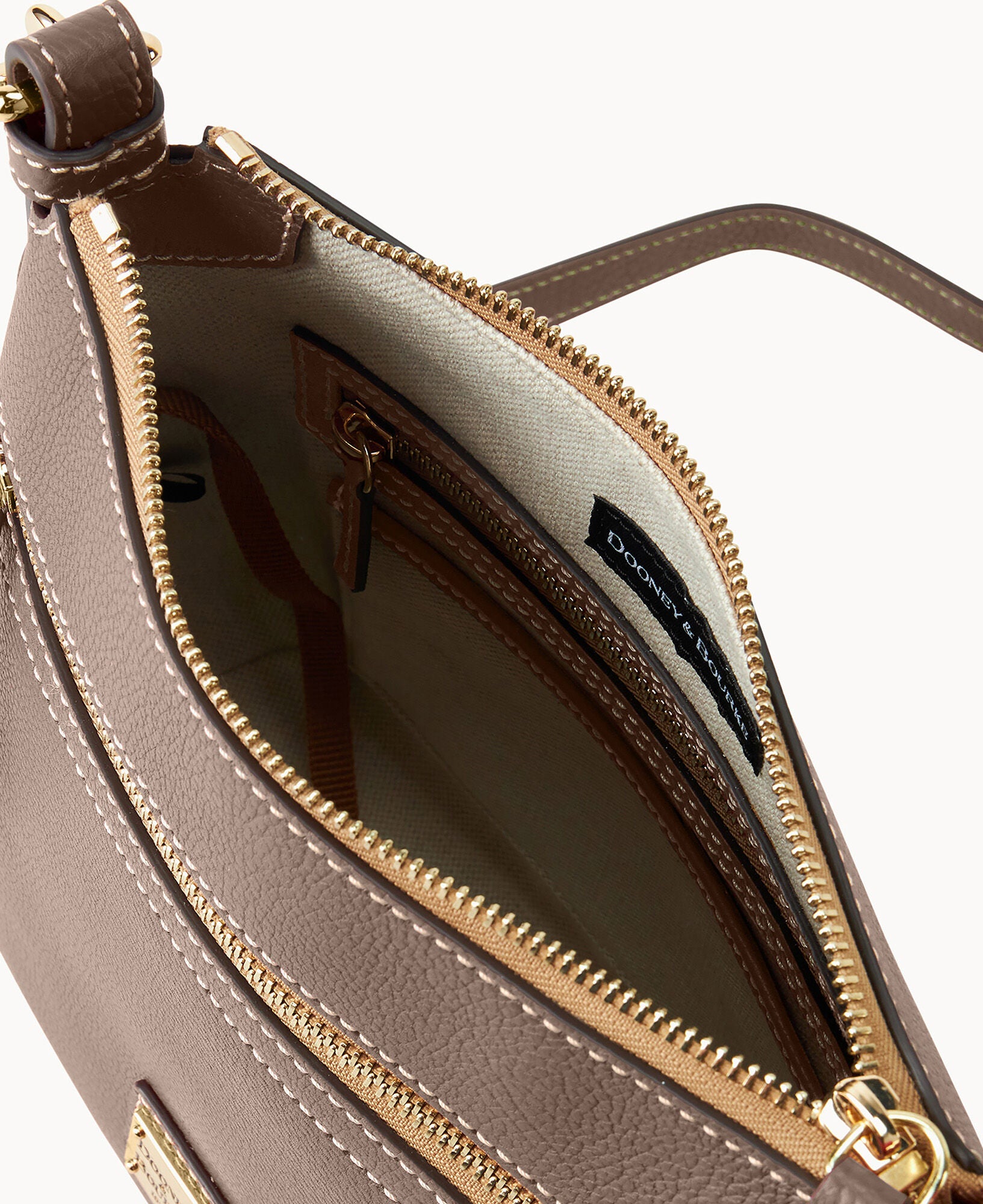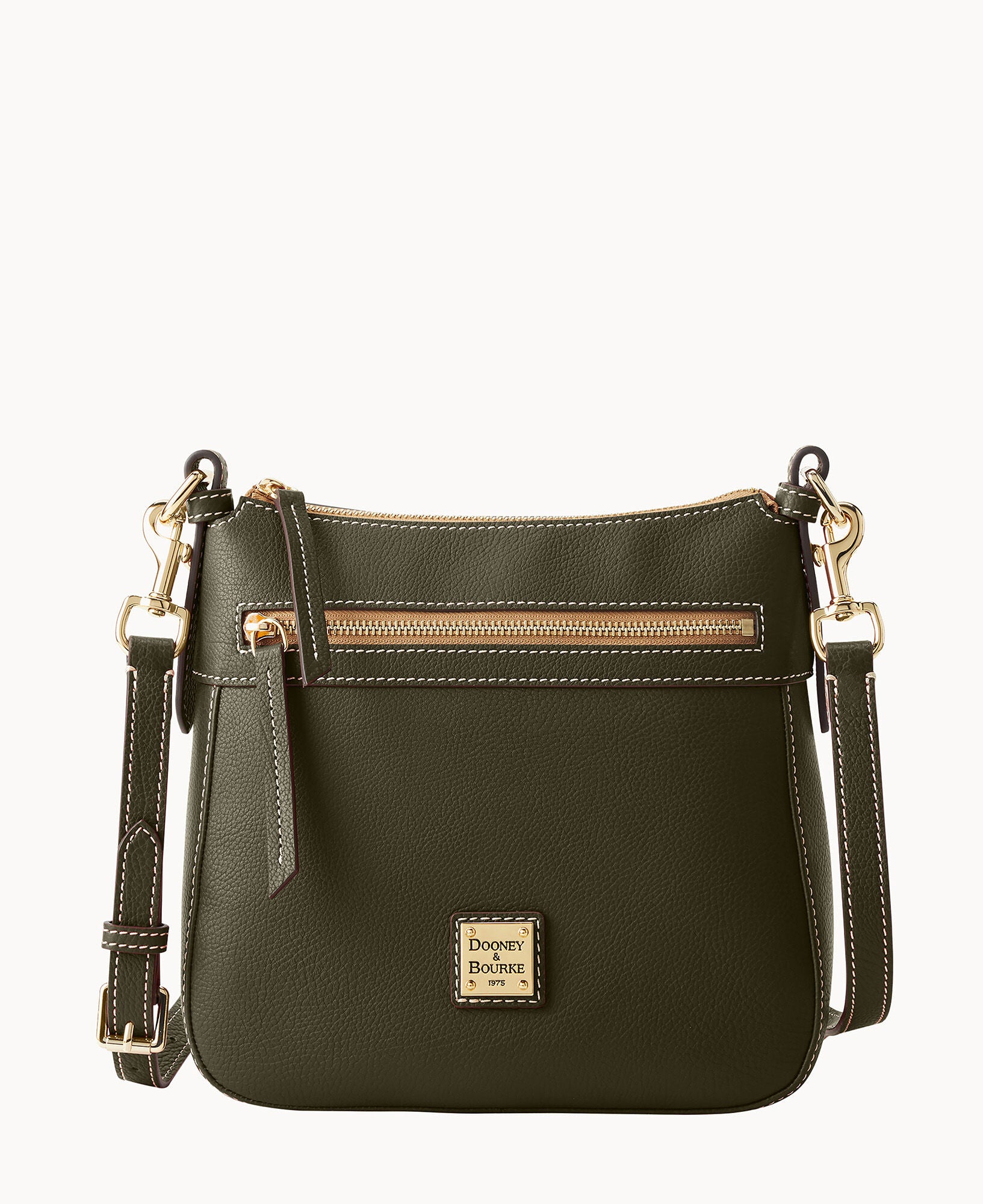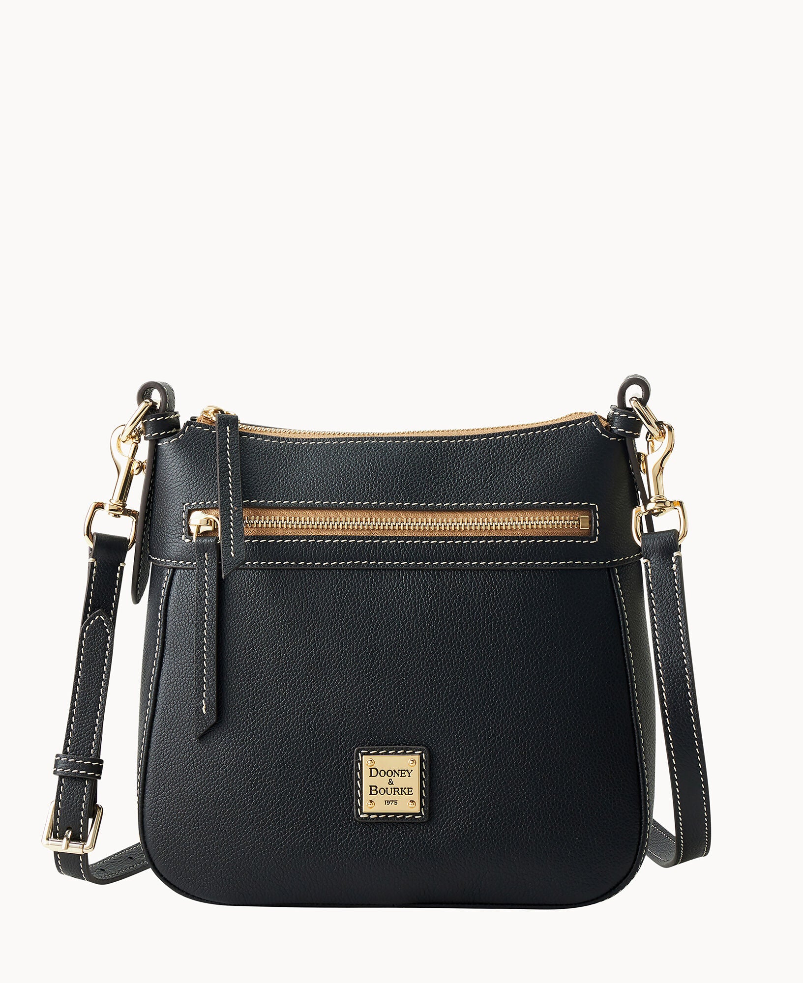 One outside zip pocket. One inside zip pocket. Two inside pockets. Adjustable, detachable shoulder strap. Strap drop length 27″. Inside key hook. Lined. Zipper closure.