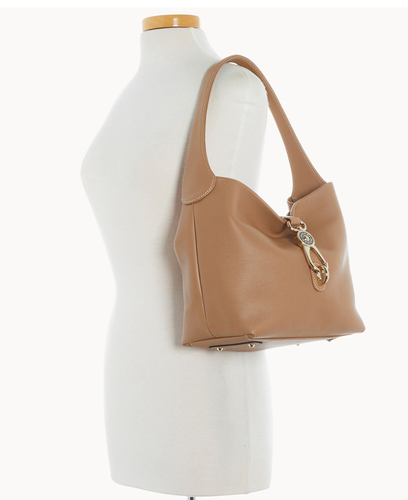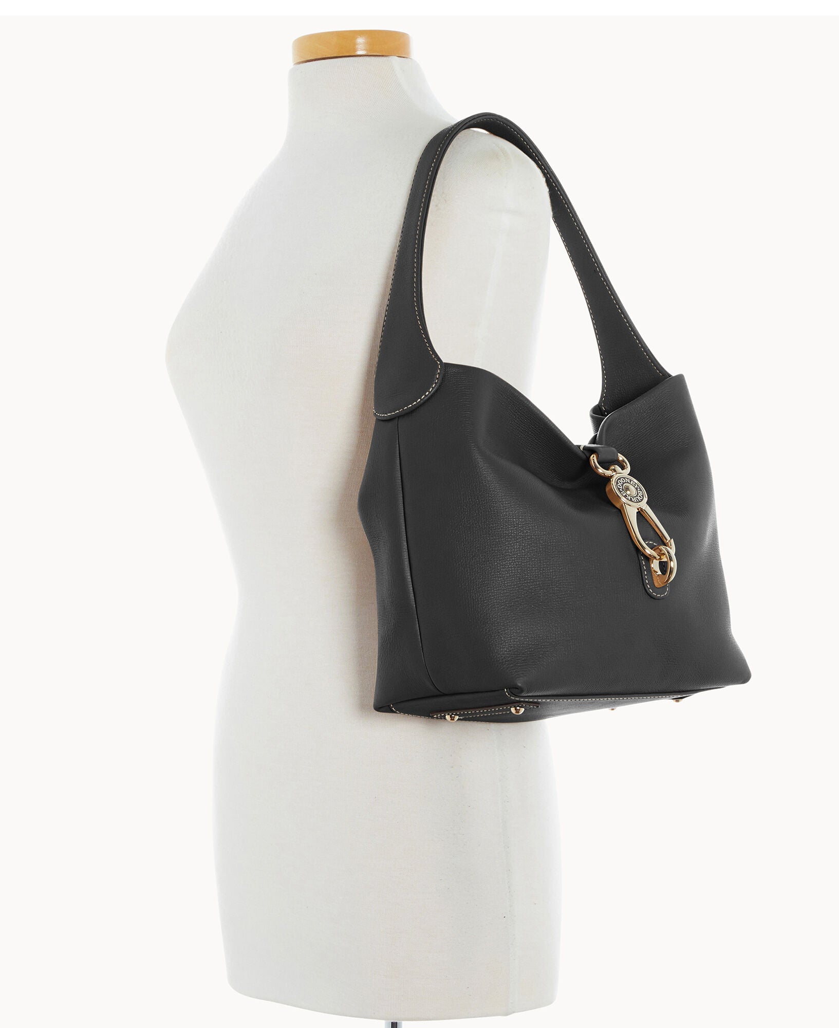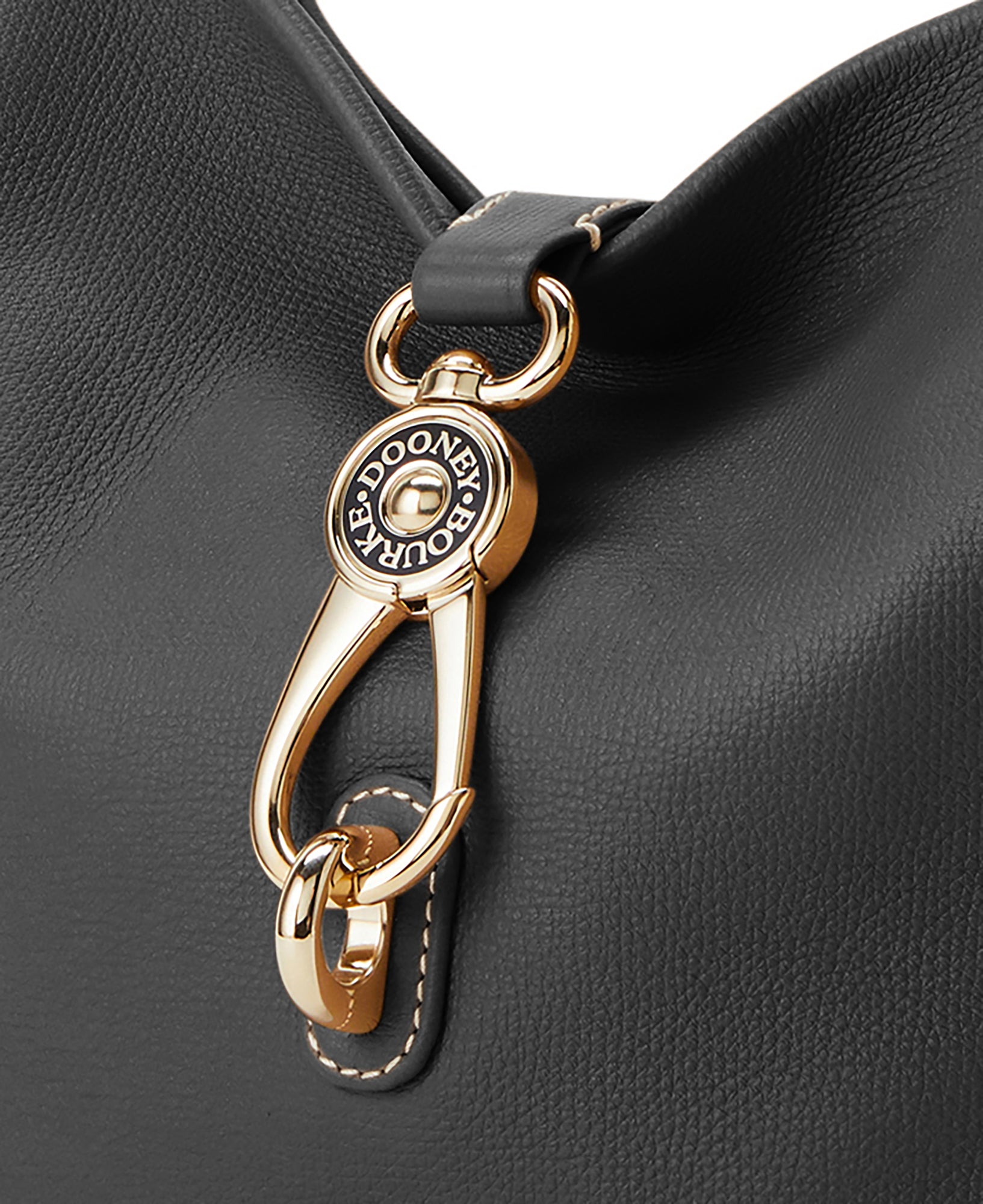 One inside zip pocket. Two inside pockets. Cell phone pocket. Inside key hook. Strap drop length 8.5″. Lined. Feet. Signature double sided Dooney & Bourke logo lock closure.