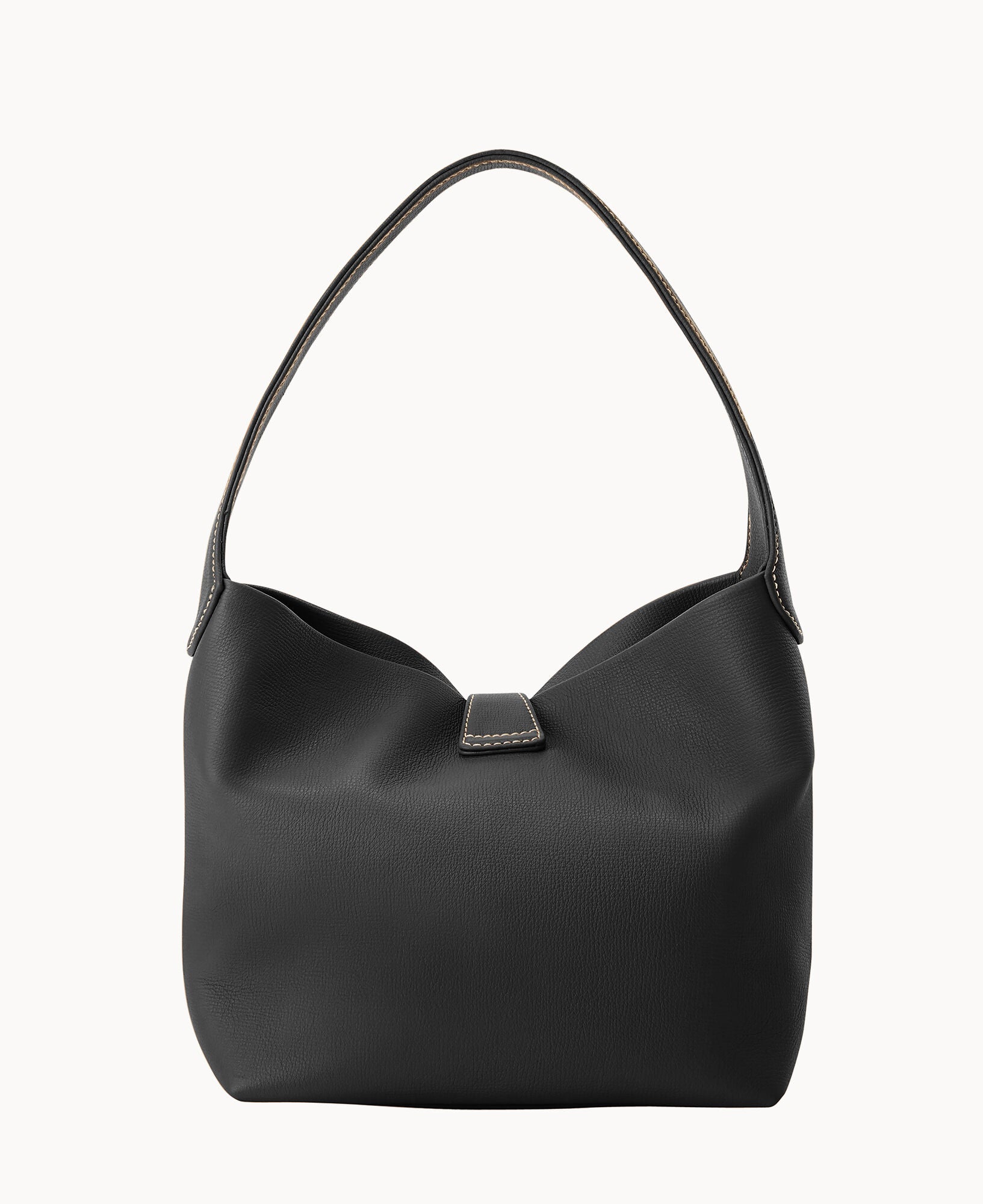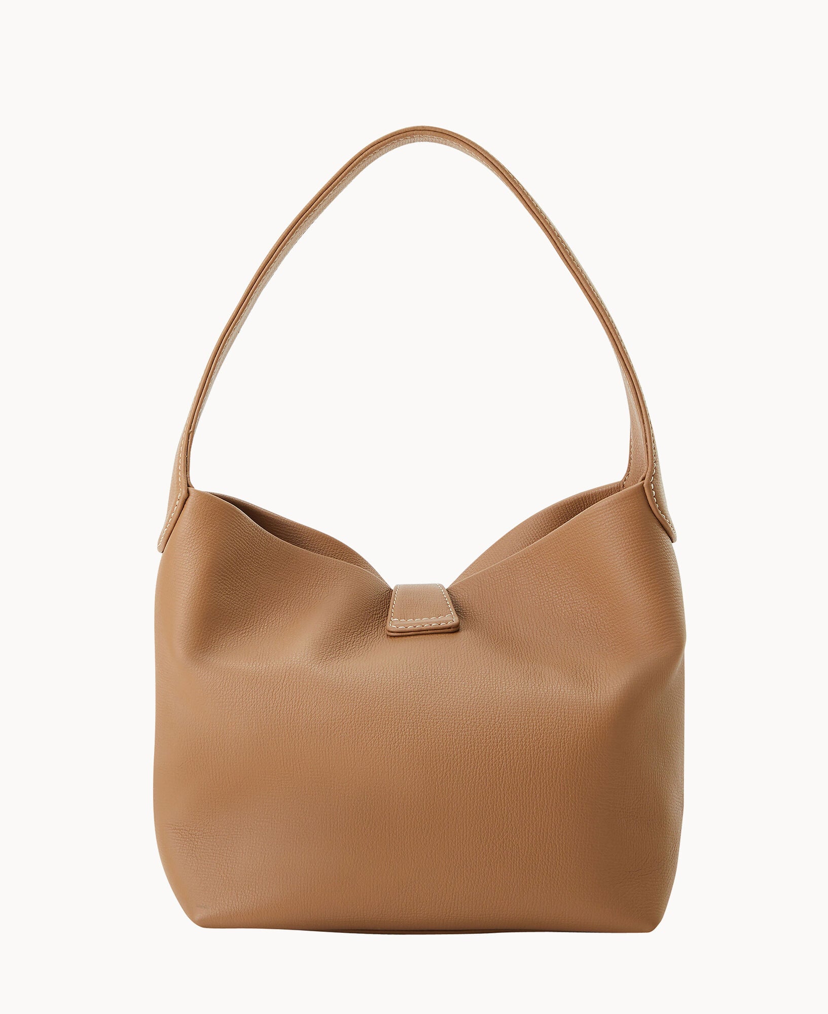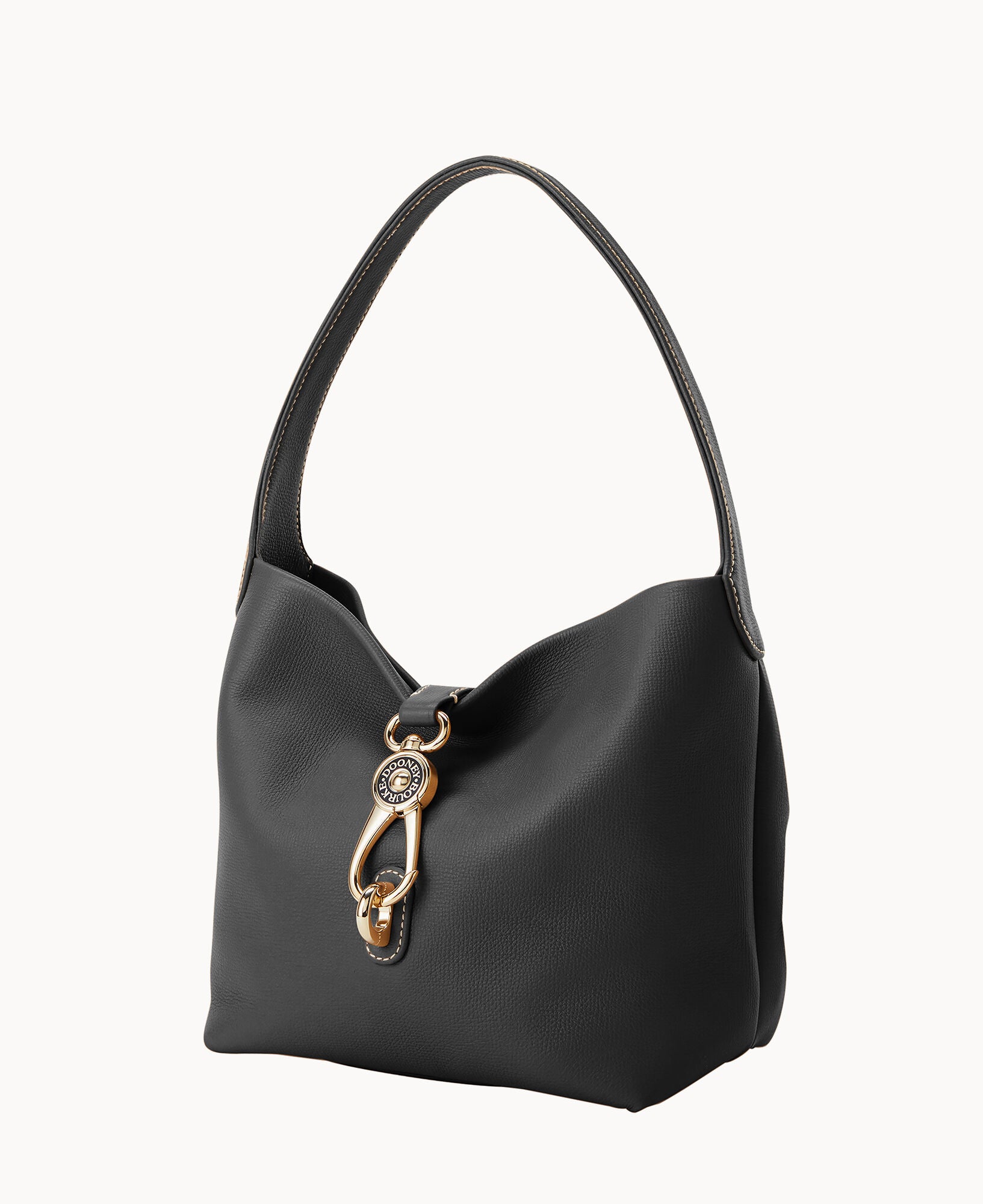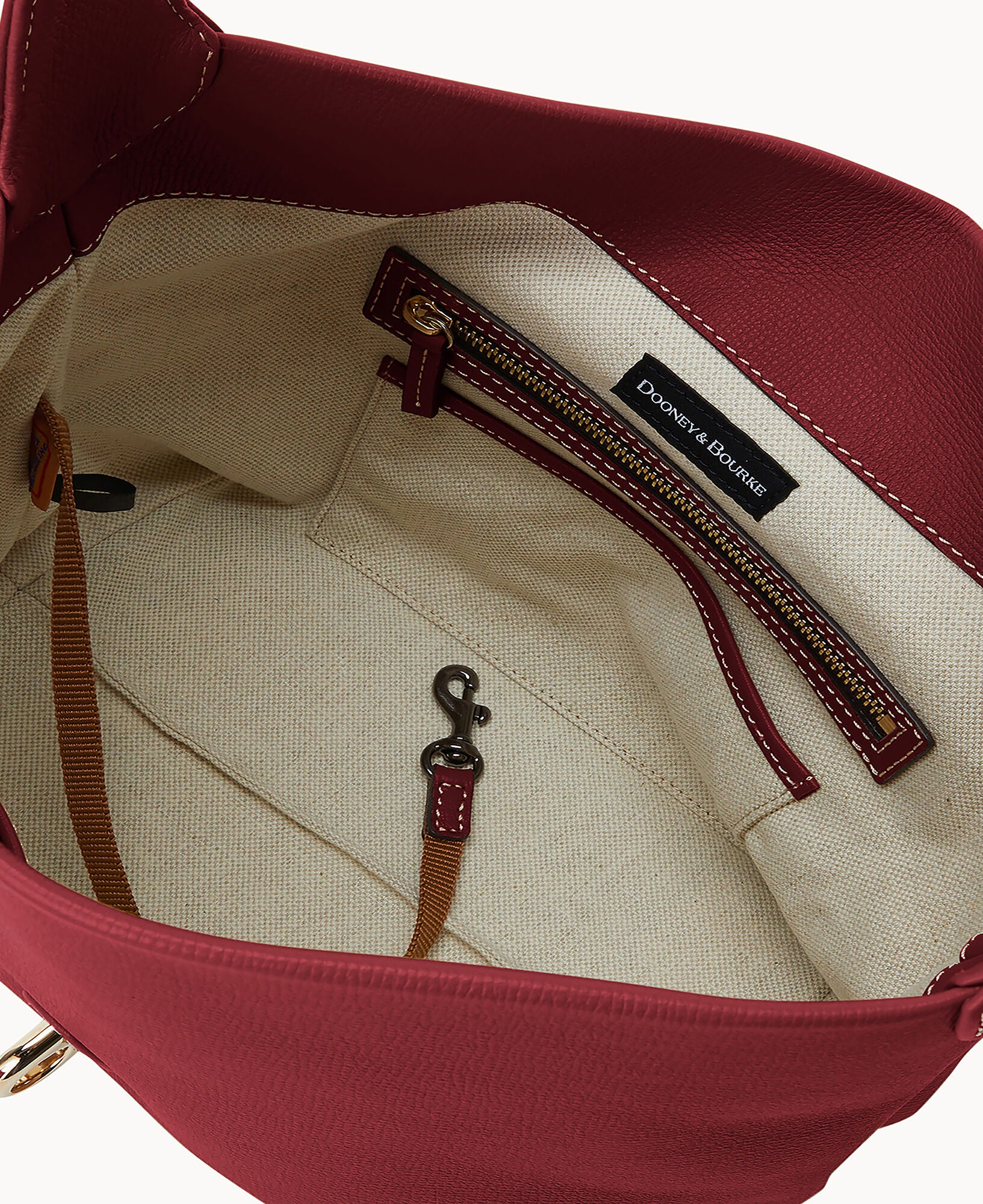One inside zip pocket. Two inside pockets. Cell phone pocket. Inside key hook. Strap drop length 8.5″. Lined. Feet. Signature double sided Dooney & Bourke logo lock closure.