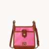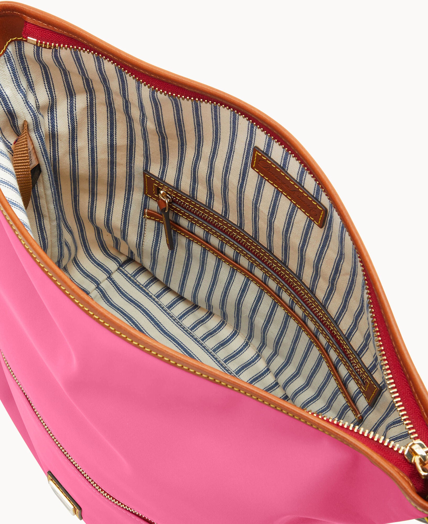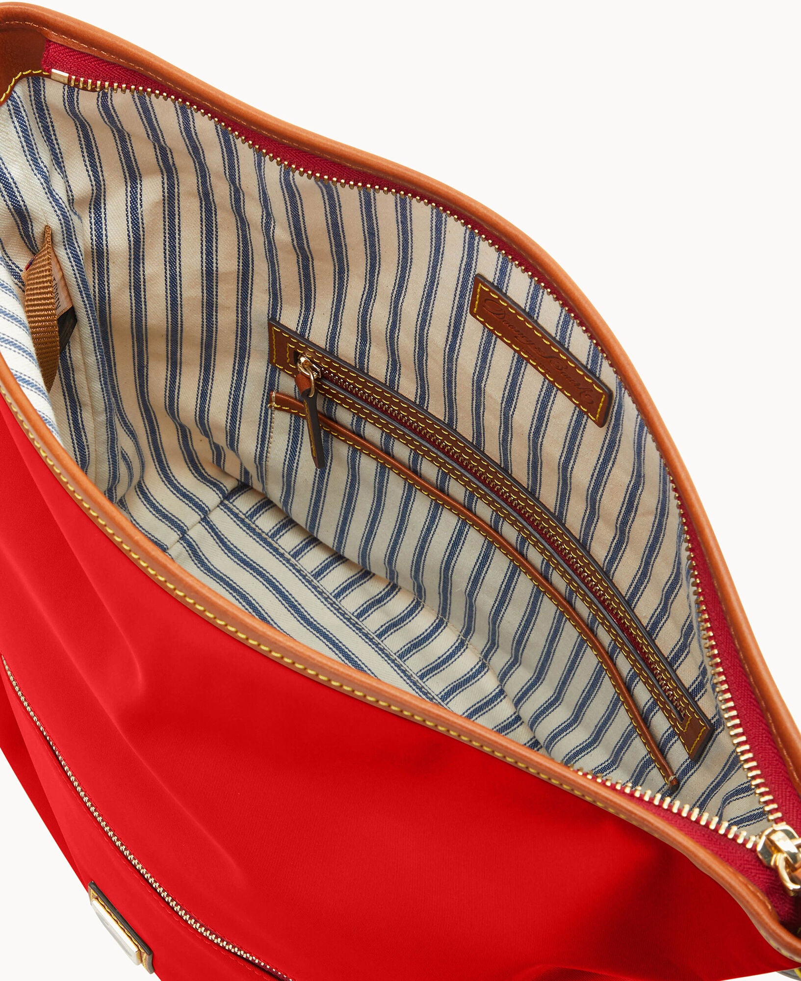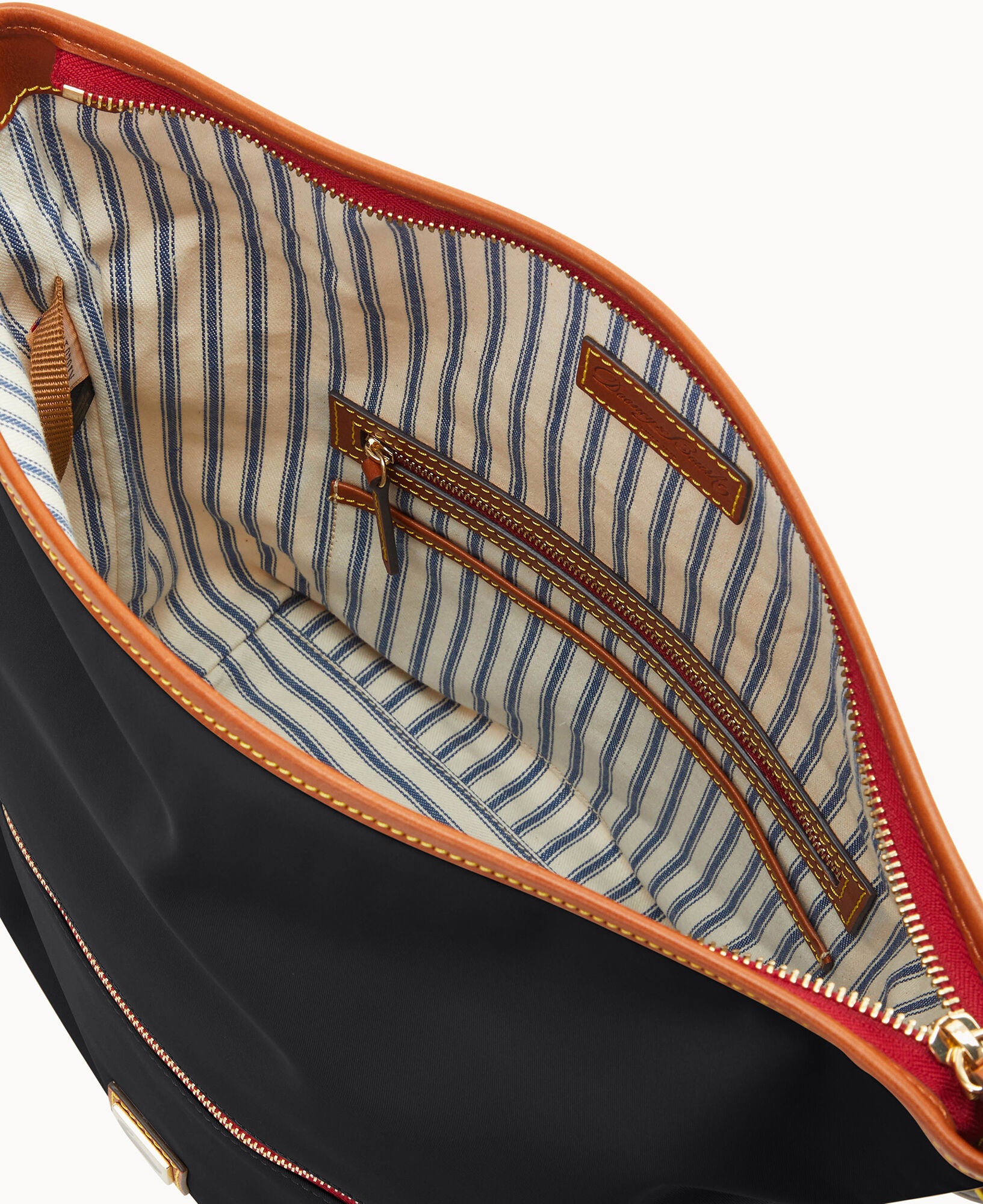 One outside zip pocket. One inside zip pocket. Two inside pockets. Cell phone pocket. Inside key hook. Detachable shoulder strap. Strap drop length 11.5″. Feet. Zipper closure.