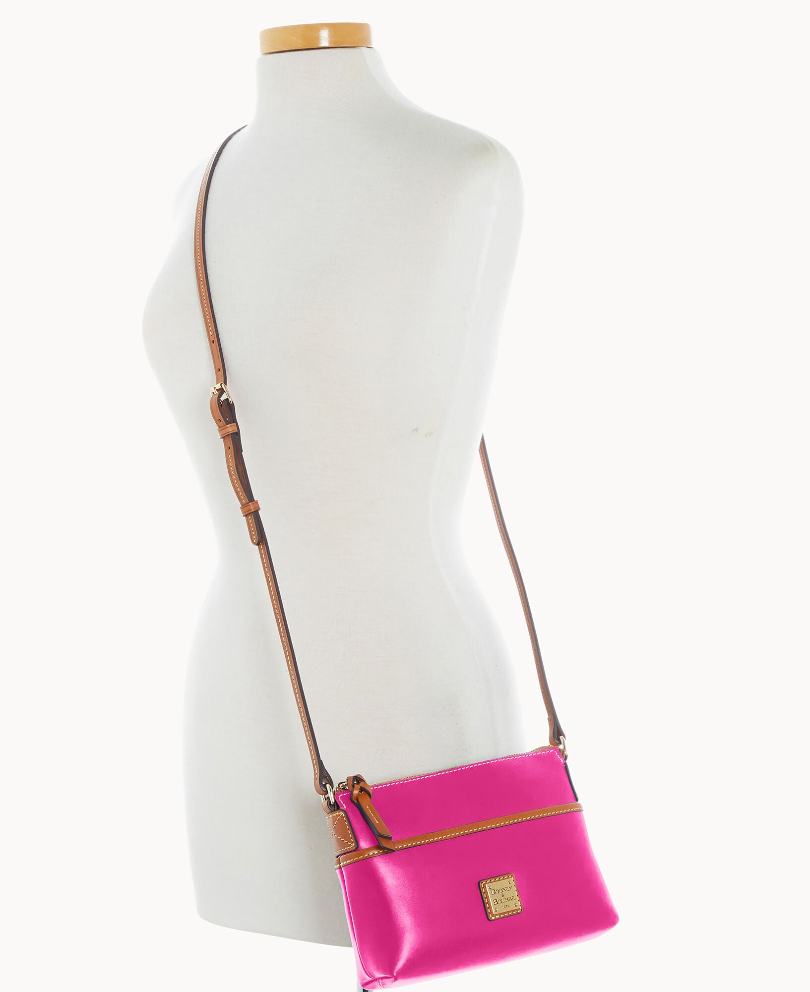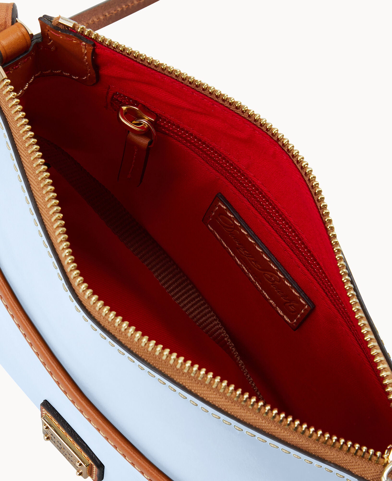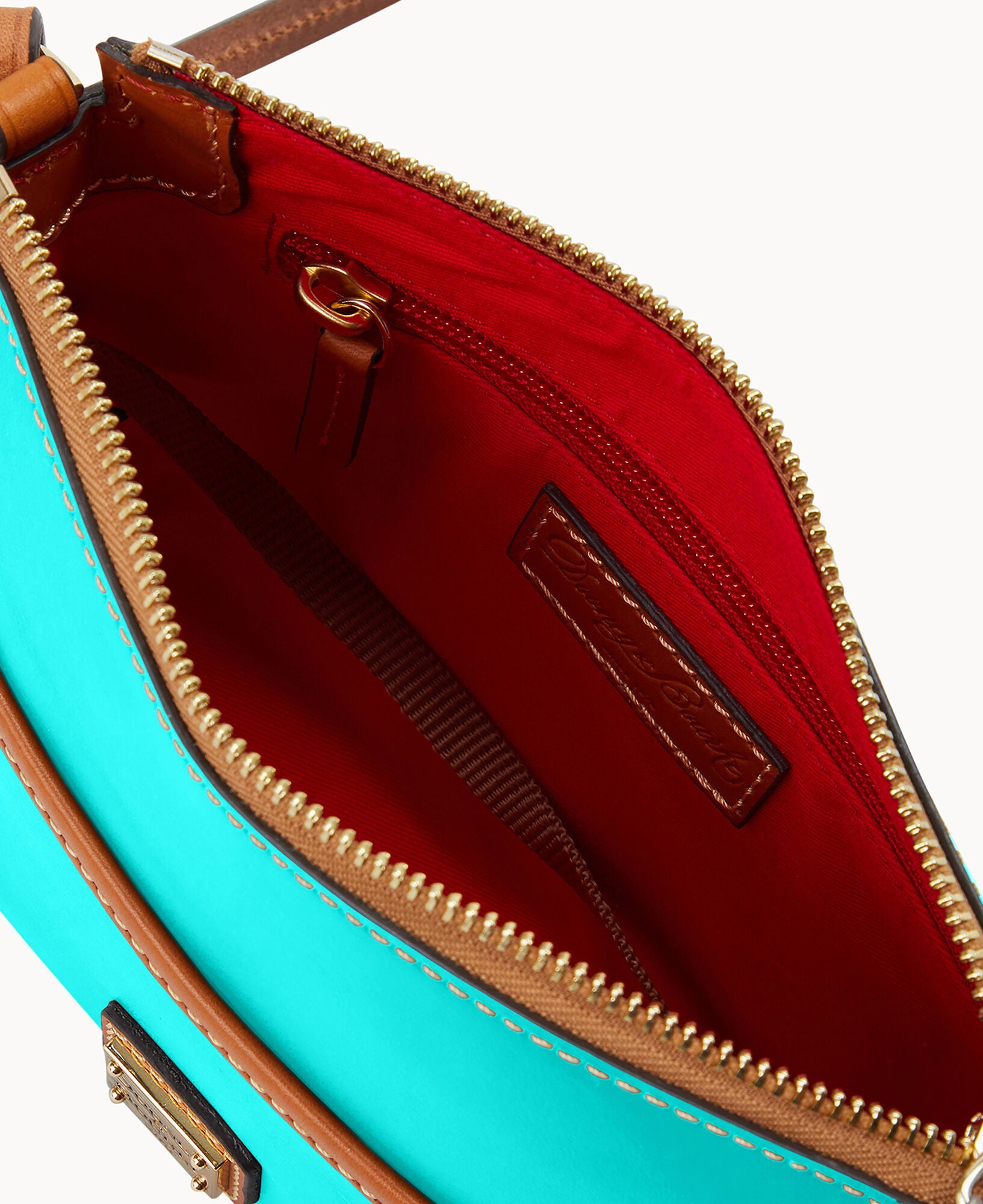 Two outside pockets. One inside zip pocket. One inside pocket. Strap drop length 28″. Inside key hook. Lined. Zipper closure.
